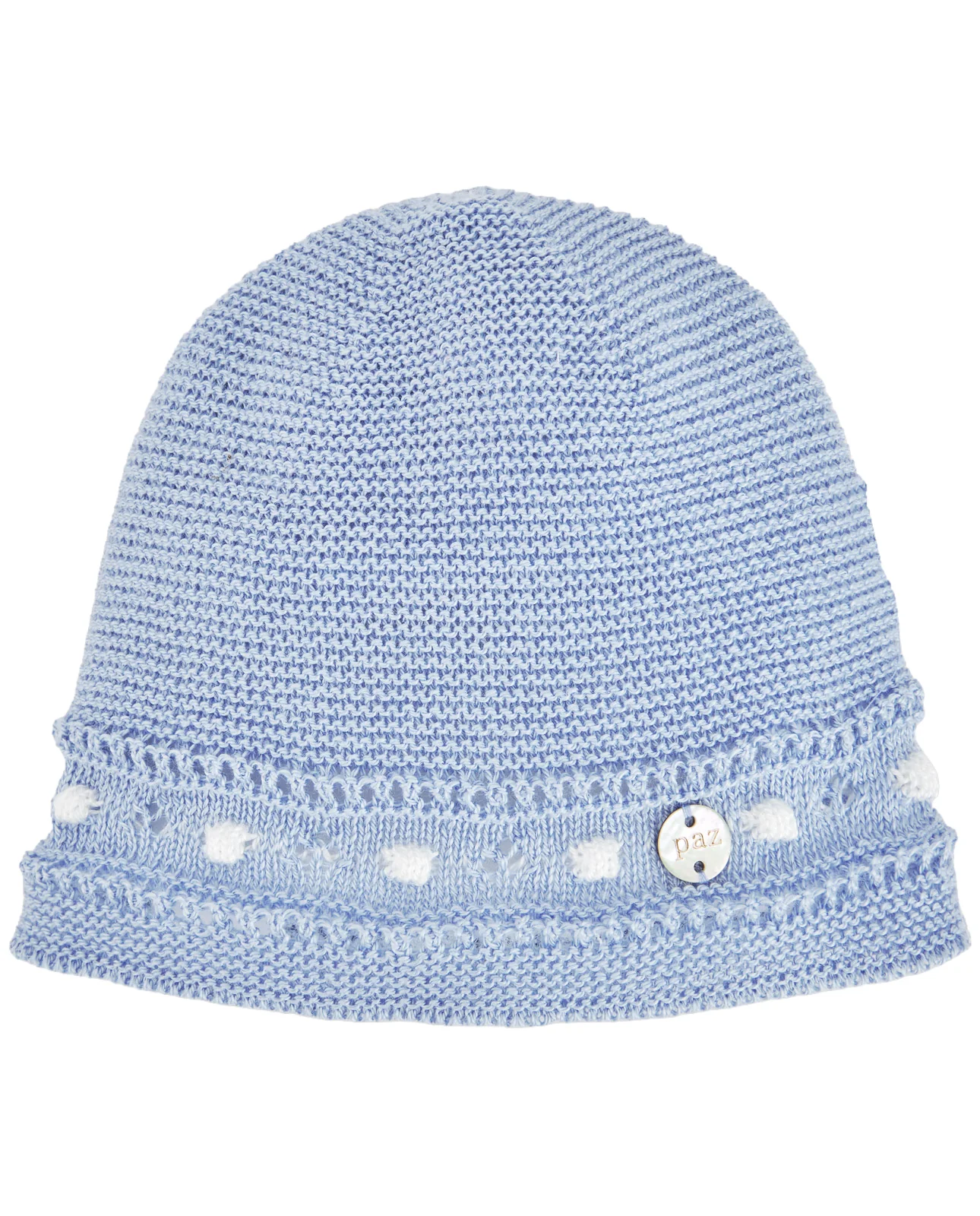 Gorro de punto para bebé con delicado patrón calado y acabado artesanal. Su textura transpirable y suave lo convierten en un complemento ideal para los primeros meses.