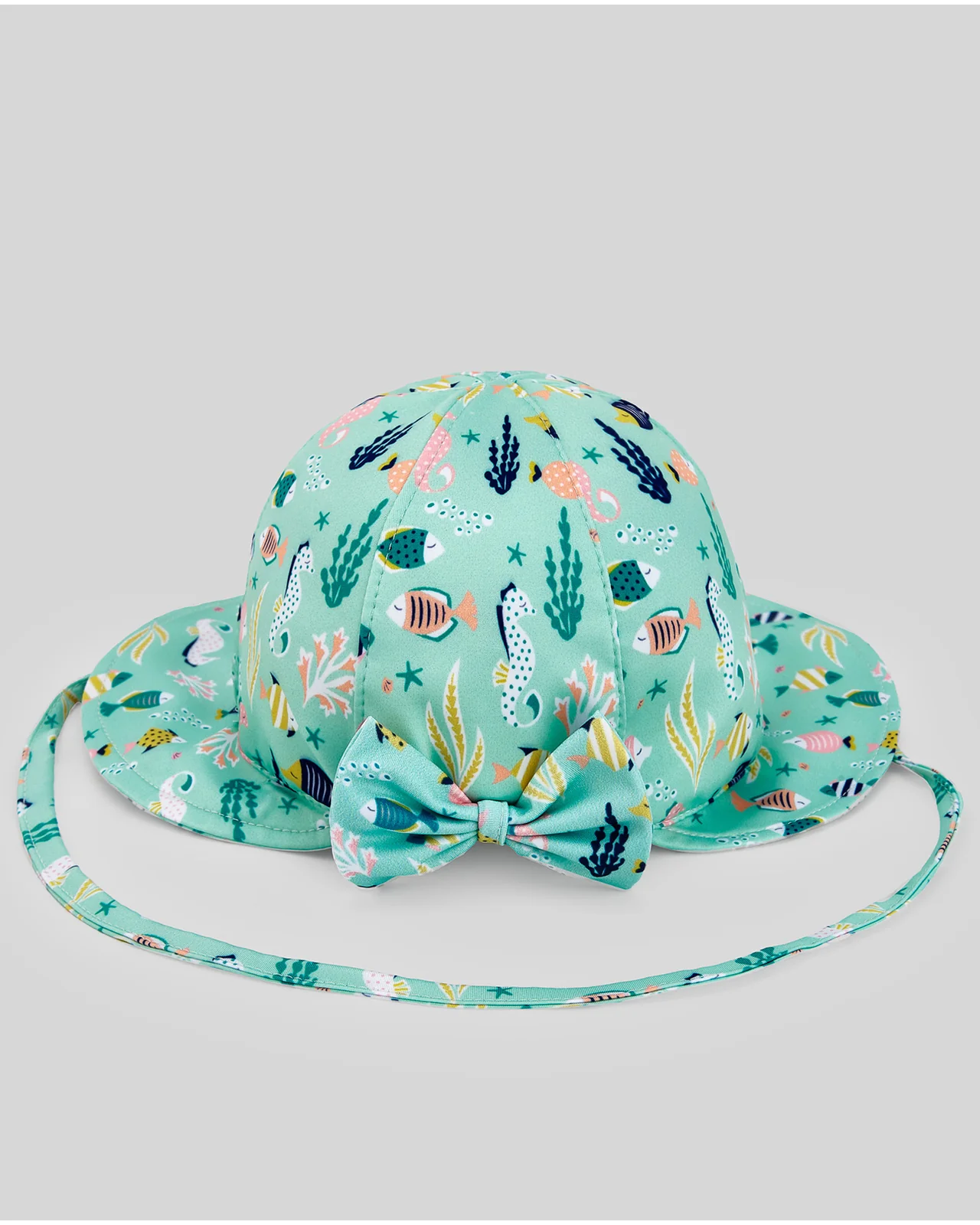 Gorrito de playa o piscina en tejido técnico. Estampado marino. Detalle de lacito en la parte posterior. Cordón para mayor confort.