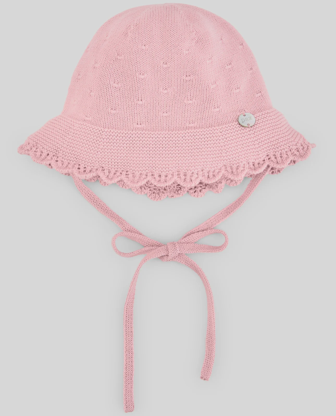 Sombrero de punto para bebé con diseño encantador y lazo de ajuste. Ideal para proteger al bebé del sol con un toque dulce y elegante.