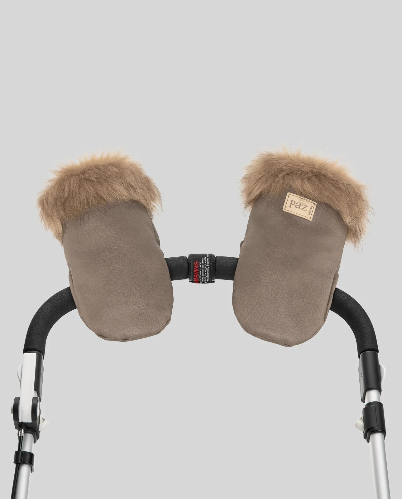 Guantes para silla de bebé confeccionados en poli-piel con interior de pelo corto y adorno puños de pelo largo. Adaptable a todas las sillas de bebé y sujección con imán.
