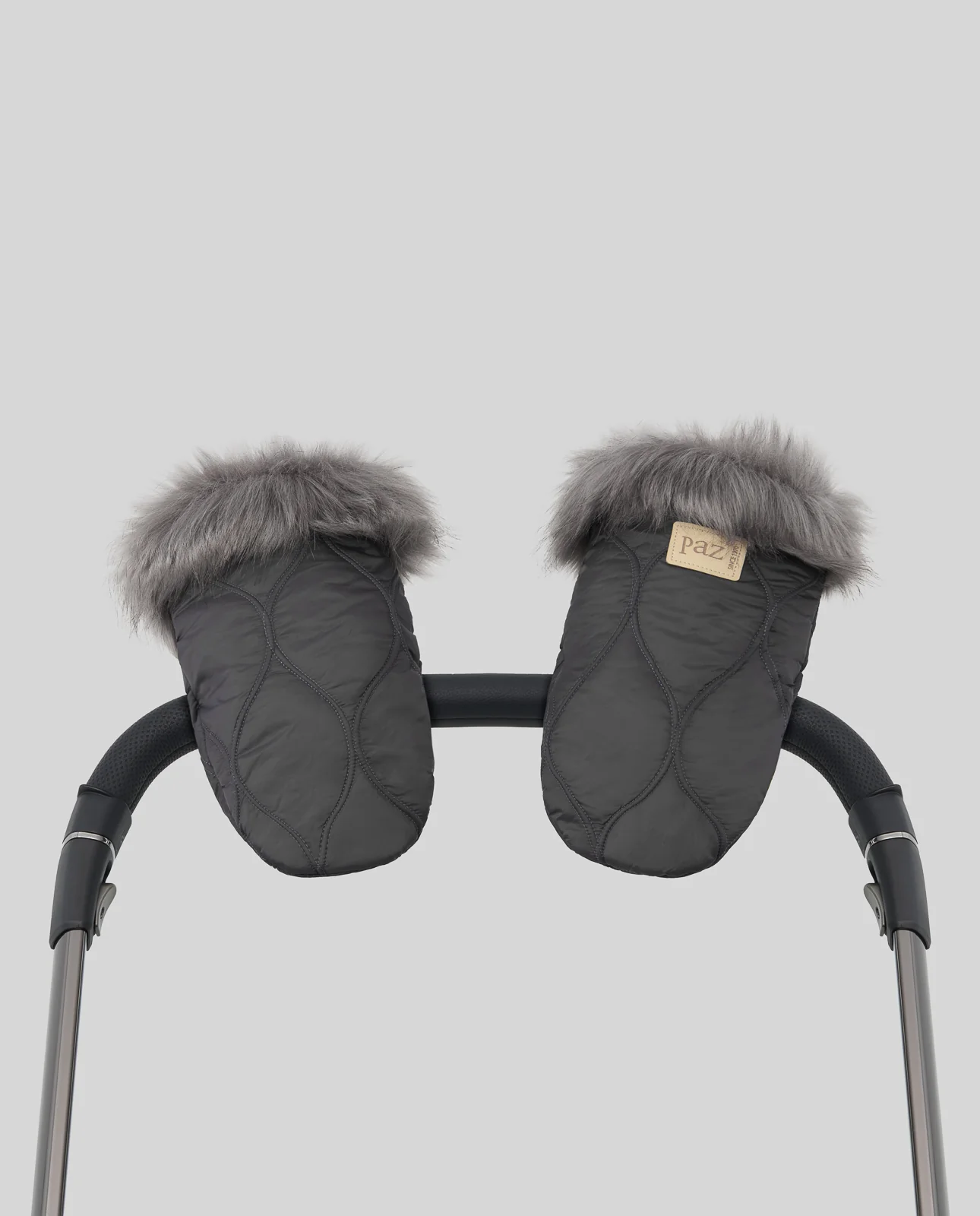 Guantes para silla de bebé confeccionados en tejido acolchado, con interior de pelo corto y adorno puños de pelo largo. Adaptable a todas las sillas de bebé y sujección con imán.