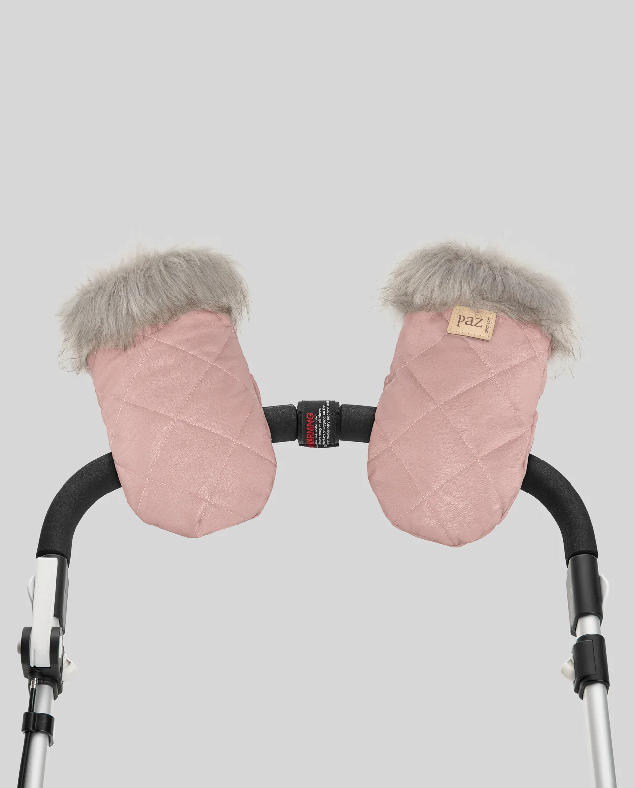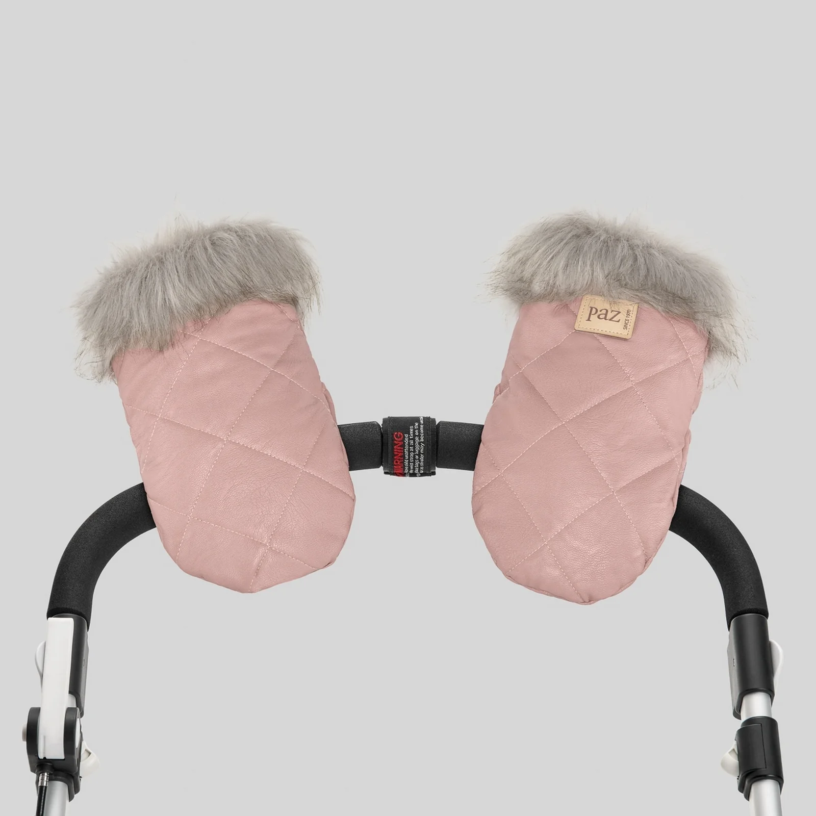 Guantes para silla de bebé confeccionados en polipiel acolchada con interior de pelo corto y adorno puños de pelo largo. Adaptable a todas las sillas de bebé y sujección con imán.