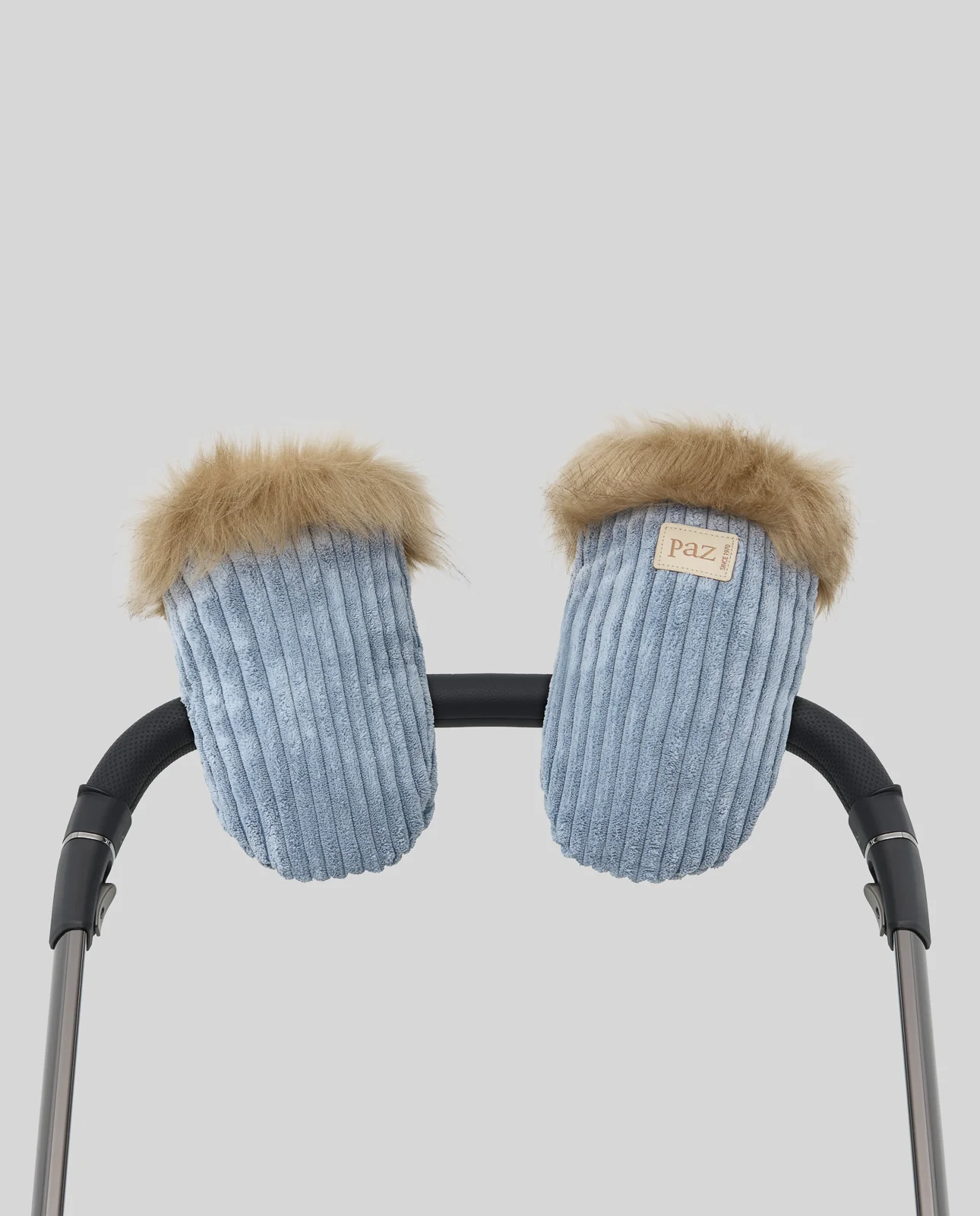 Guantes para silla de bebé confeccionados en pana ancha con interior de pelo corto y adorno puños de pelo largo. Adaptable a todas las sillas de bebé y sujección con imán.