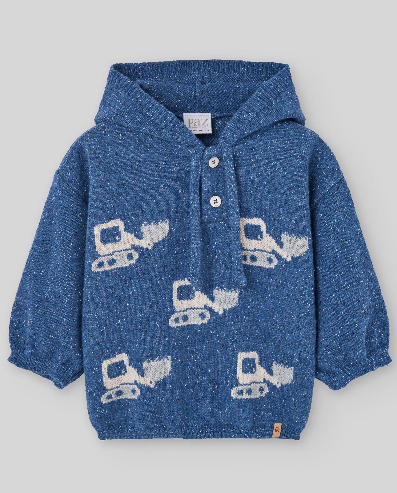 Jersey con capucha, ilustración tejida de vehículos y cierre frontal con botones.