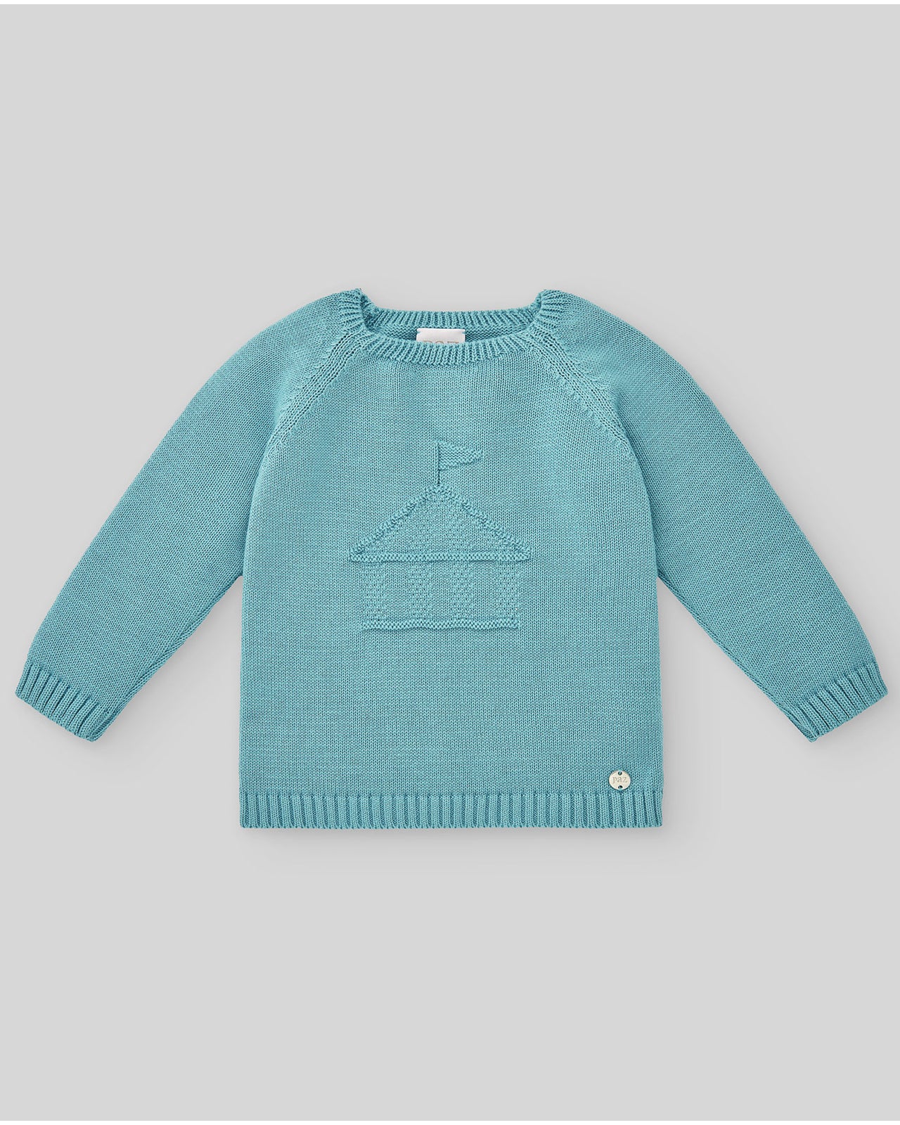 Jersey en punto liso para niños, con dibujo a tono de carpa de circo. Cuello redondo y manga larga. Acabados en rib o canalé.