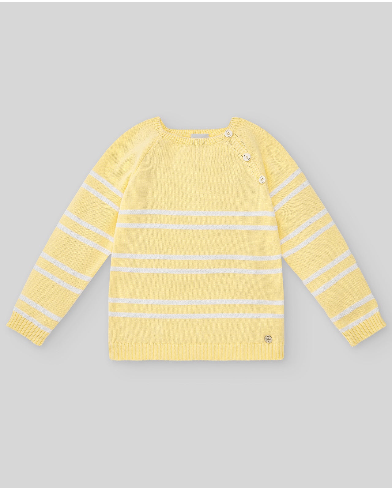 Jersey para niño en punto con detalle de listas a contraste. Cuello redondo y abertura en hombro con botones. Manga larga con remate en canalé.