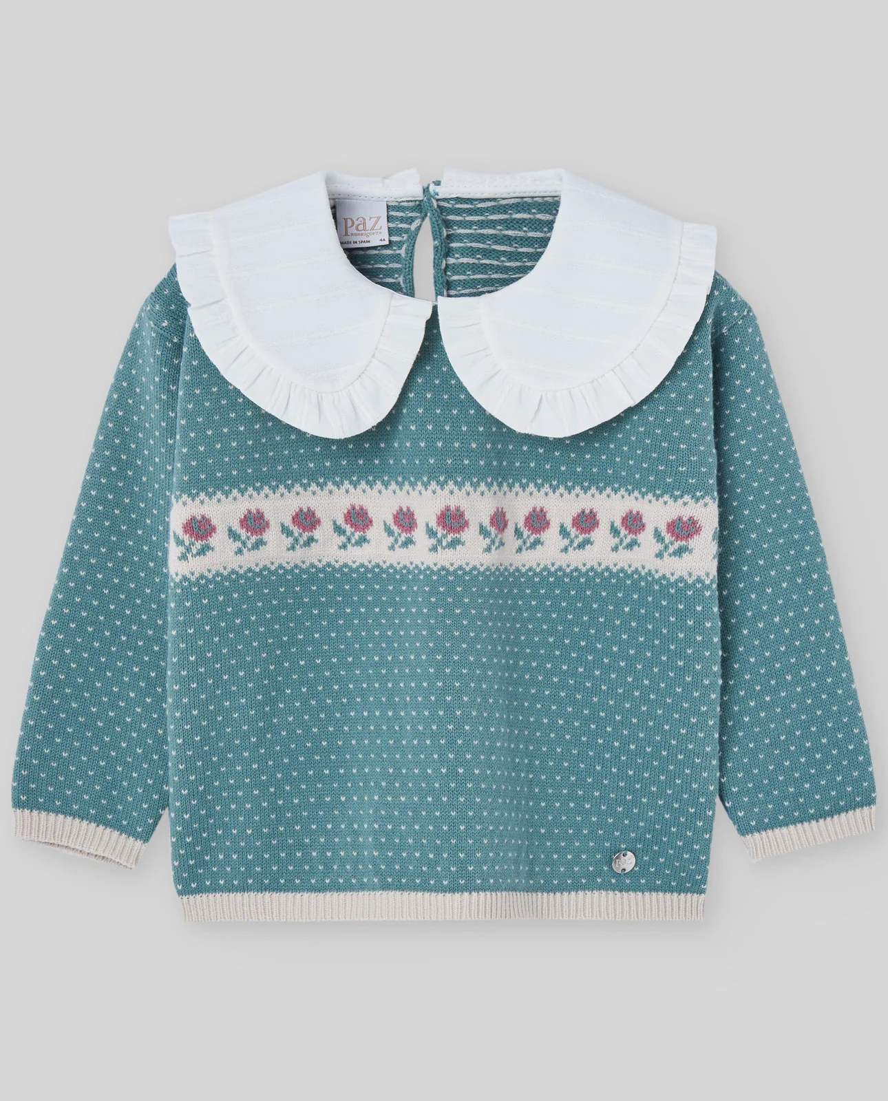Jersey con cuello amplio en tejido a contraste con volante y diseño floral central en jacquard, cierre en la espalda.
