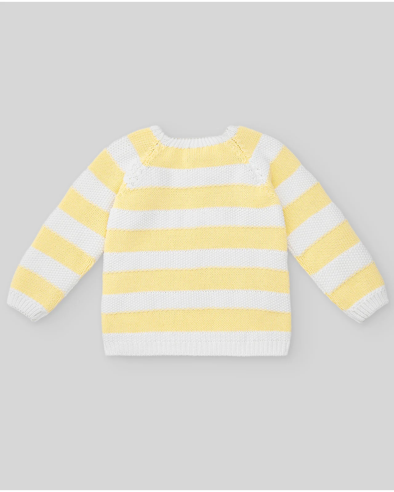 Jersey en punto combinado para niño a rayas. Cuello redondo y manga larga. Abertura en hombro con botones.