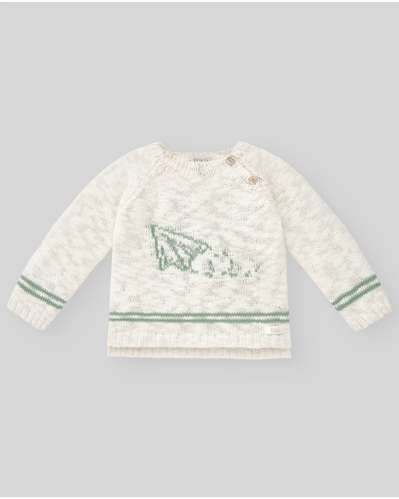 Jersey en punto rústico con dibujo en jacquard a contraste. Cuello redondo con abertura en hombro y manga larga.