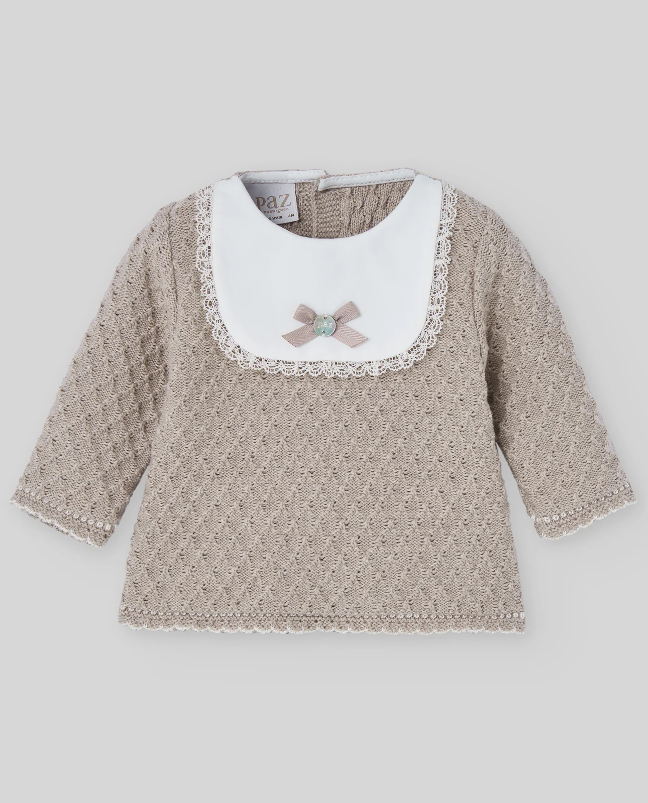 Jubón para bebé niña confeccionado en una delicada mezcla de algodón y cashmere. Destaca por su textura calada en punto trabajado y una pechera de tela blanca rematada con un pequeño lazo y botón nacarado. Presenta manga larga y acabados con ondas suaves en el bajo y los puños. Cierre trasero con botones. Una prenda elegante y dulce para los días de otoño e invierno.