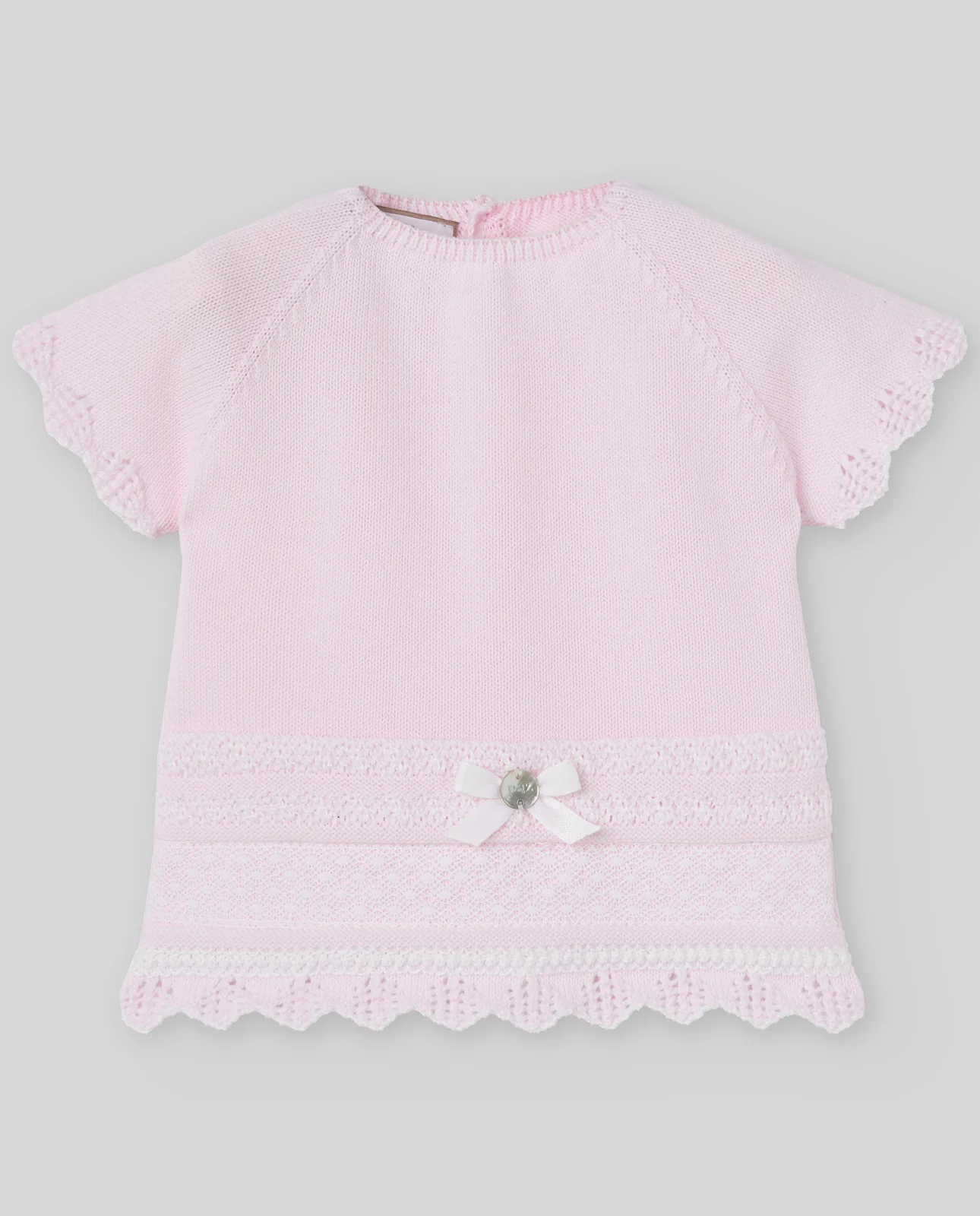 Jubón de manga corta para niña con delicado remate de ondas en mangas y bajo, y detalle de lazo con medalla. Perfecto para días cálidos y para combinar con polaina.