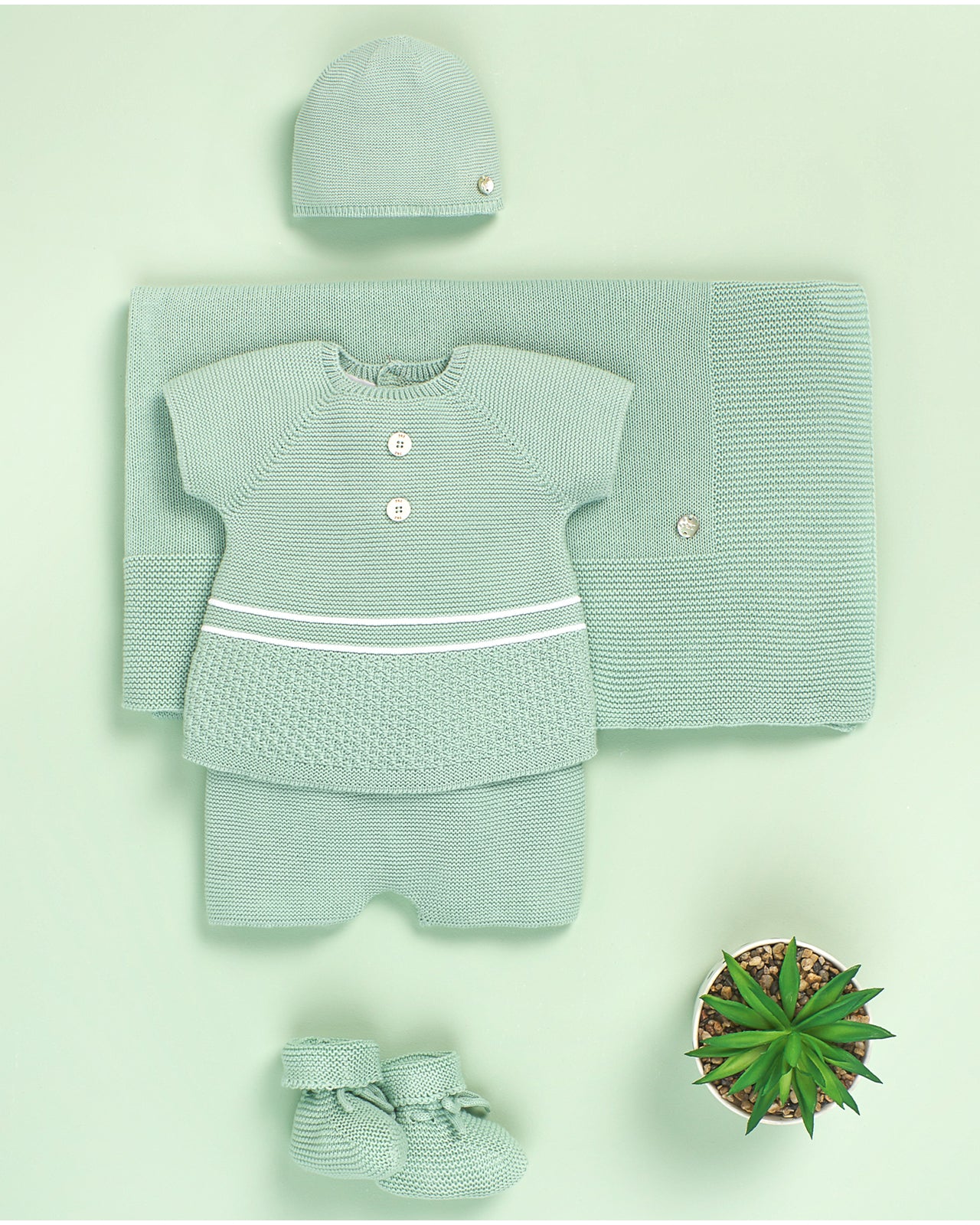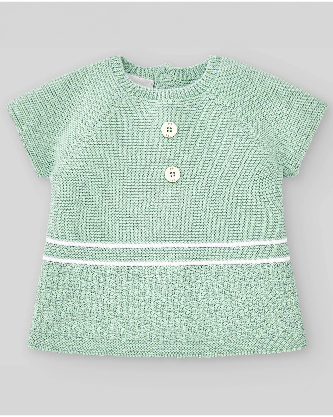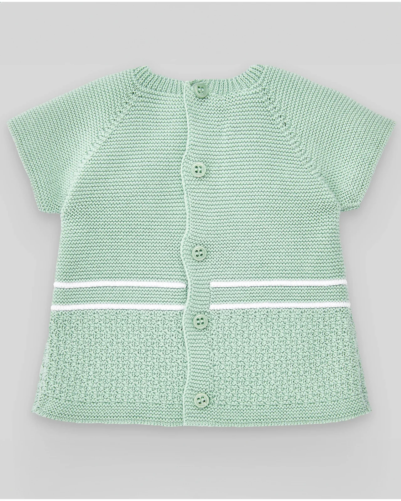Jersey o jubón para bebé en punto combinado, con cuello redondo y manga corta. Detalles a contraste y botones delanteros decorativos. Cierre trasero con botonadura. Perfecto para la temporada primavera · verano.