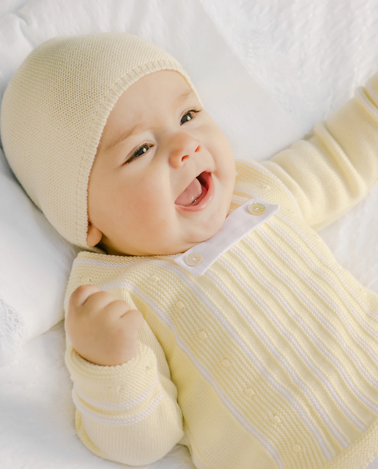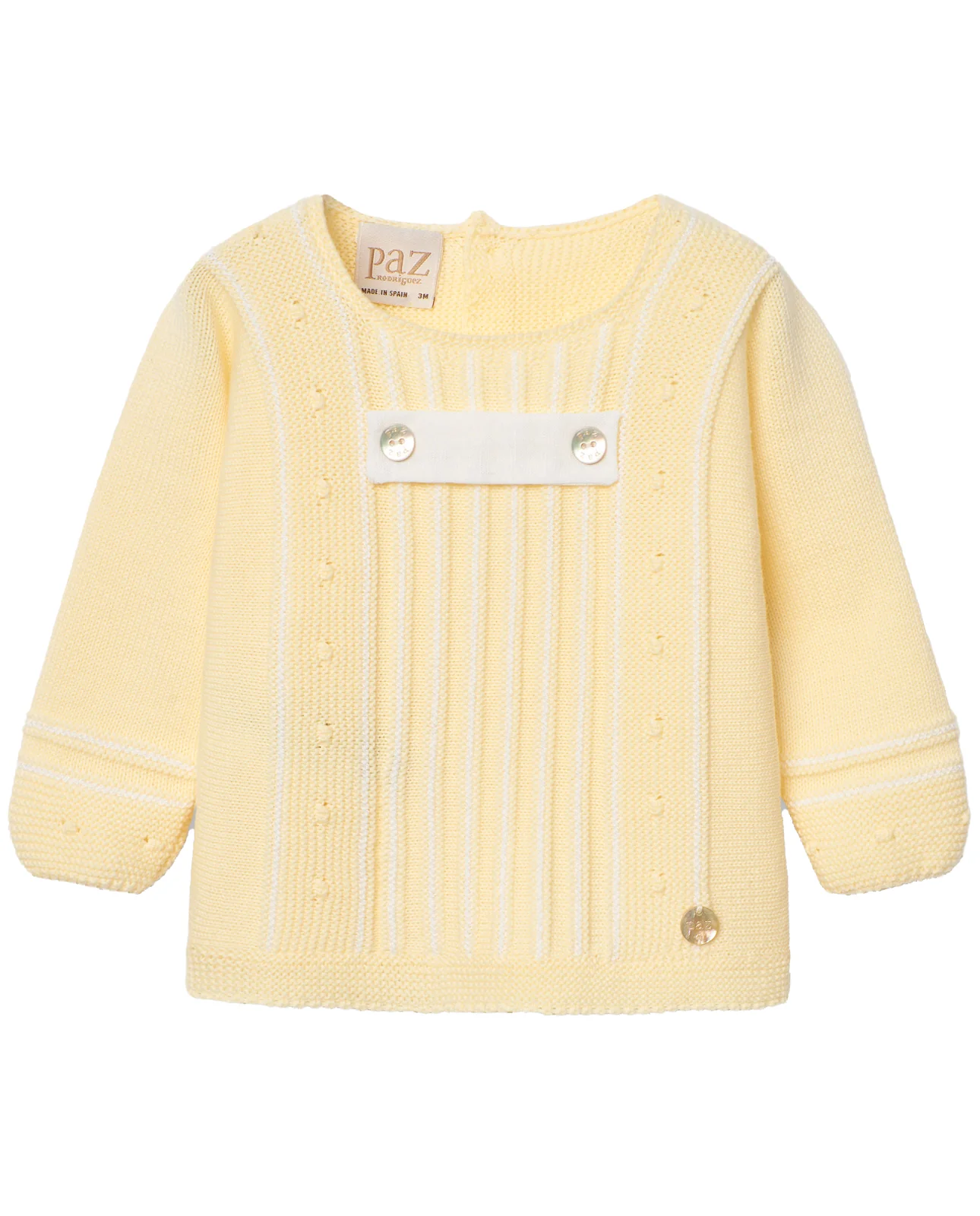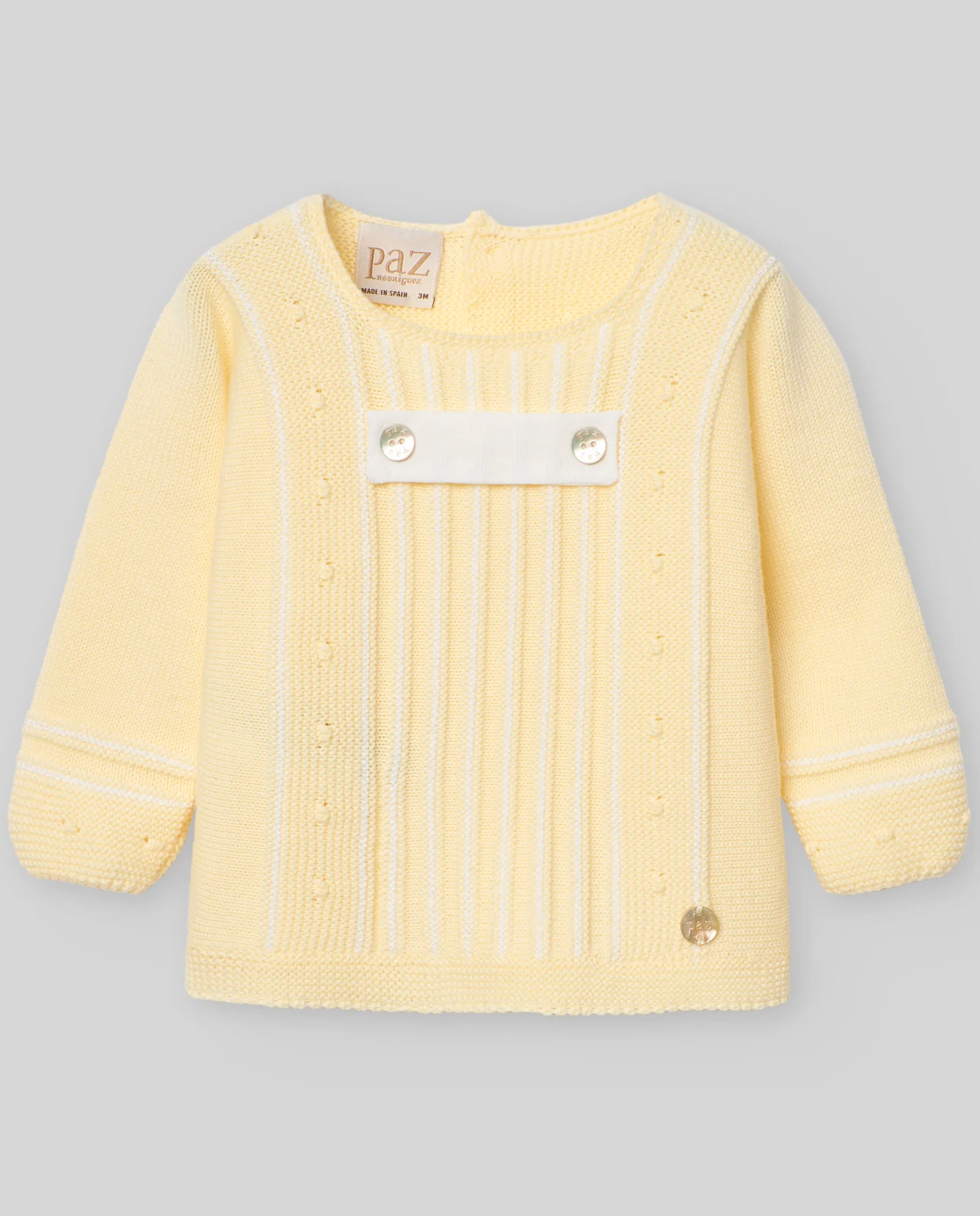 Jubón o jersey para bebé niño en punto combinado con listas verticales a contraste. Cuello redondo y manga larga. Detalle de botones decorativos en nácar sobre tejido en el pecho. Chapa de nácar PAZ en el bajo. Cierre trasero con botones a tono.