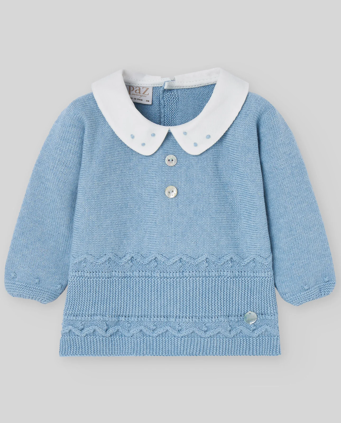 Jubón de bebé para niño confeccionado en suave mezcla de algodón y cashmere. Presenta un diseño de punto con detalle de grecas en la parte inferior y delicados pespuntes decorativos. El cuello bebé en tejido blanco aporta un toque clásico y elegante, decorado con bordados a contraste. Cierre trasero con botones