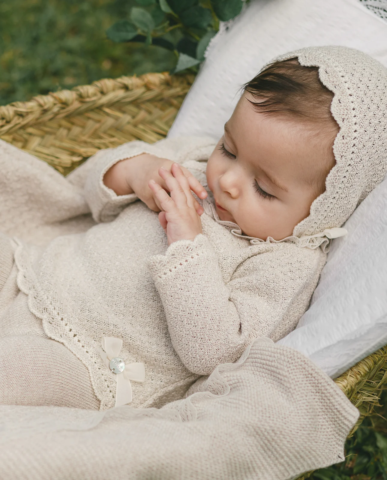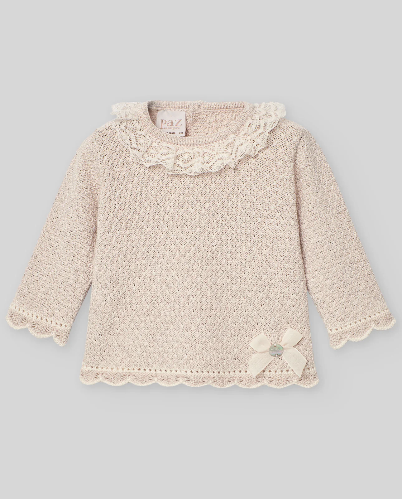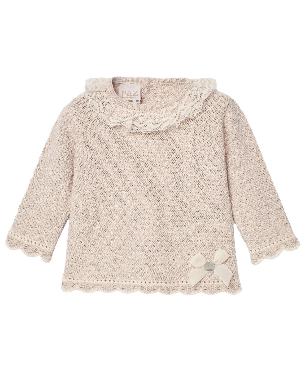 Jubón o jersey para bebé niña en punto trabajado, con remates de ondas a mano y calados. Cierre trasero con botonadura. Cuello con puntilla y lacito con placa de nácar PAZ Rodríguez.