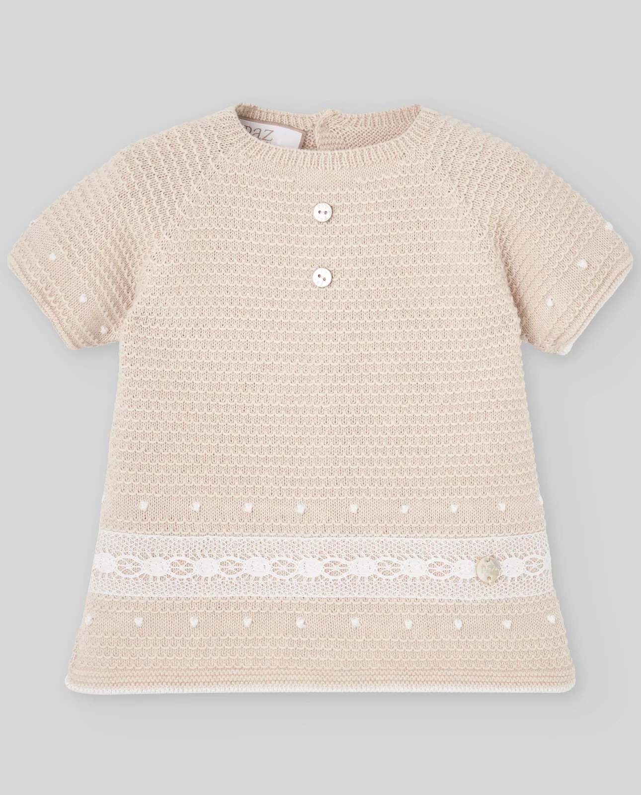 Jubón de niño de manga corta con delicado punto fantasía. El doble botón decorativo en el delantero y el remate de encaje en el bajo le dan un estilo distinguido. Perfecto para conjuntar con la polaina de la colección.