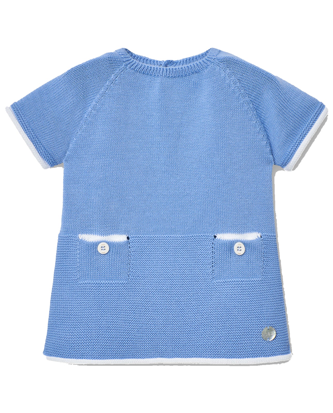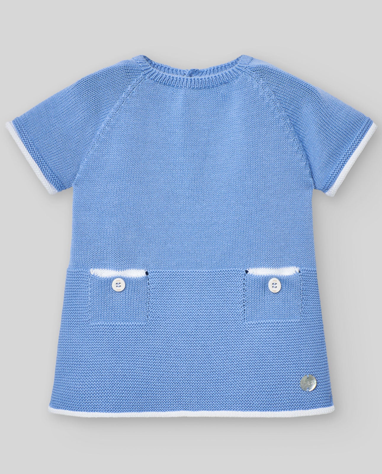Jersey o jubón para bebé en punto combinado, con cuello redondo y manga corta. Bolsillos delanteros decorativos. Cierre trasero con botonadura. Perfecto para la temporada primavera · verano.