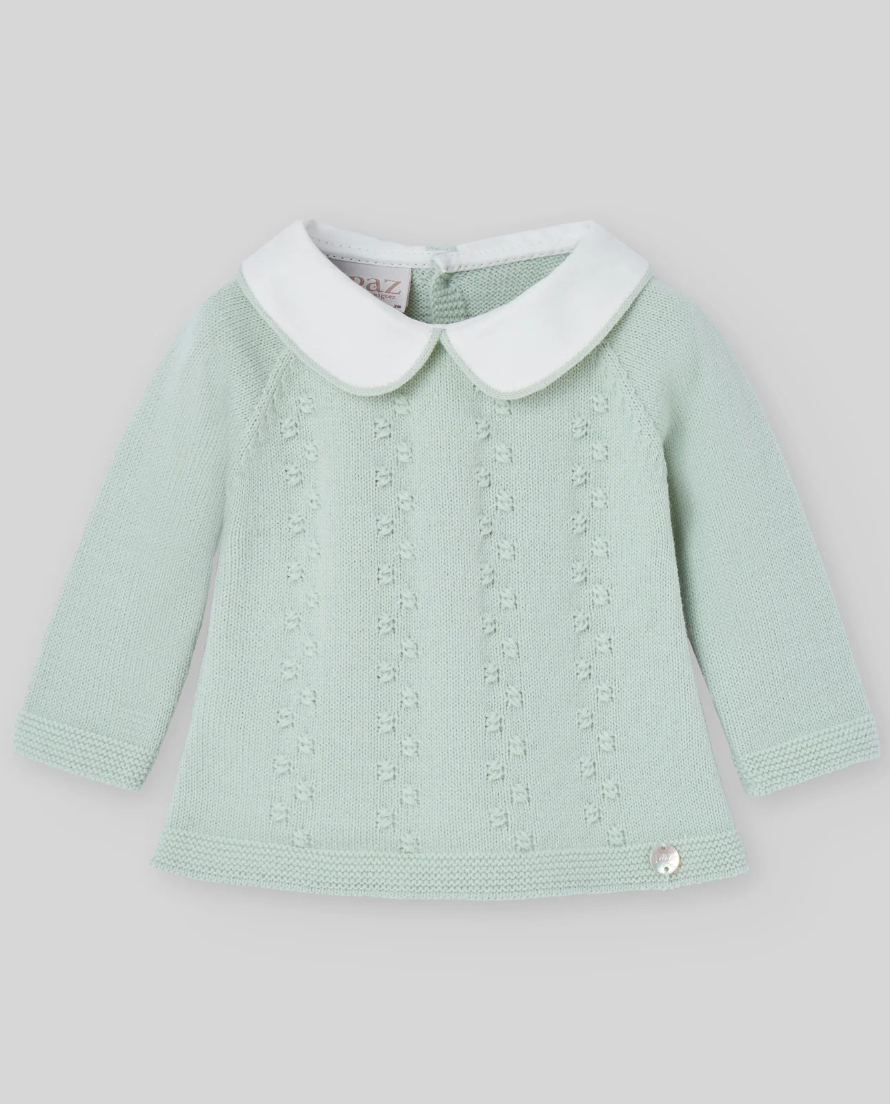 Jubón de manga larga con detalles de ochos y calados. Cuello camisero de tela en contraste y botonadura central. Prenda práctica y con un estilo dulce, perfecta para los looks más especiales.
