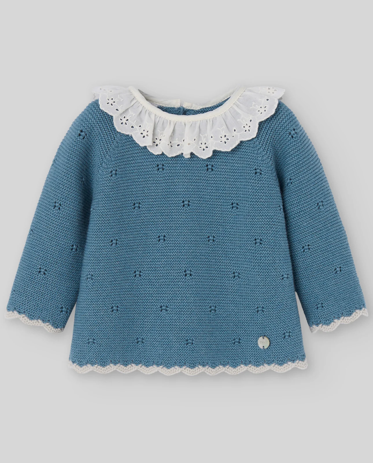 Jubón de punto con manga larga, confeccionado en una mezcla suave de algodón y cashmere. Presenta un diseño calado decorativo en el cuerpo, rematado con volante en puños y bajo que aporta movimiento y detalle. Cuello redondo y cierre con botones en la parte trasera. Un diseño cálido y cuidado para los meses más fríos.