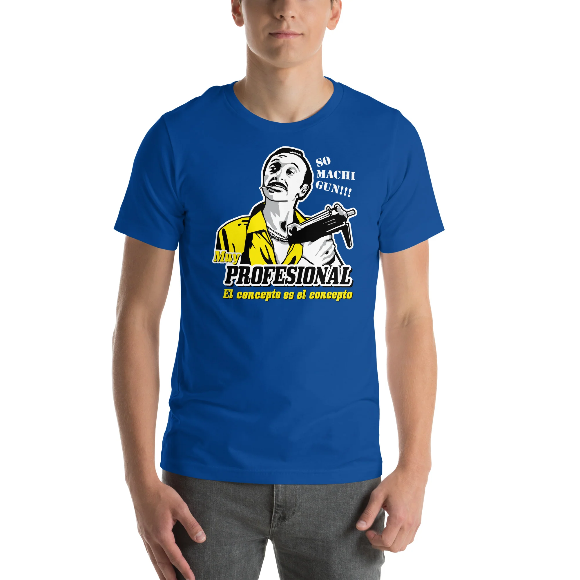 Camiseta oda al humor más castizo y surrealista del cine español, con Pazos de la película Airbag en pose desafiante, con metralleta en mano y la frase “SO MACHI GUN!!!”, acompañada de Muy Profesional y su lema inmortal: El concepto es el concepto.