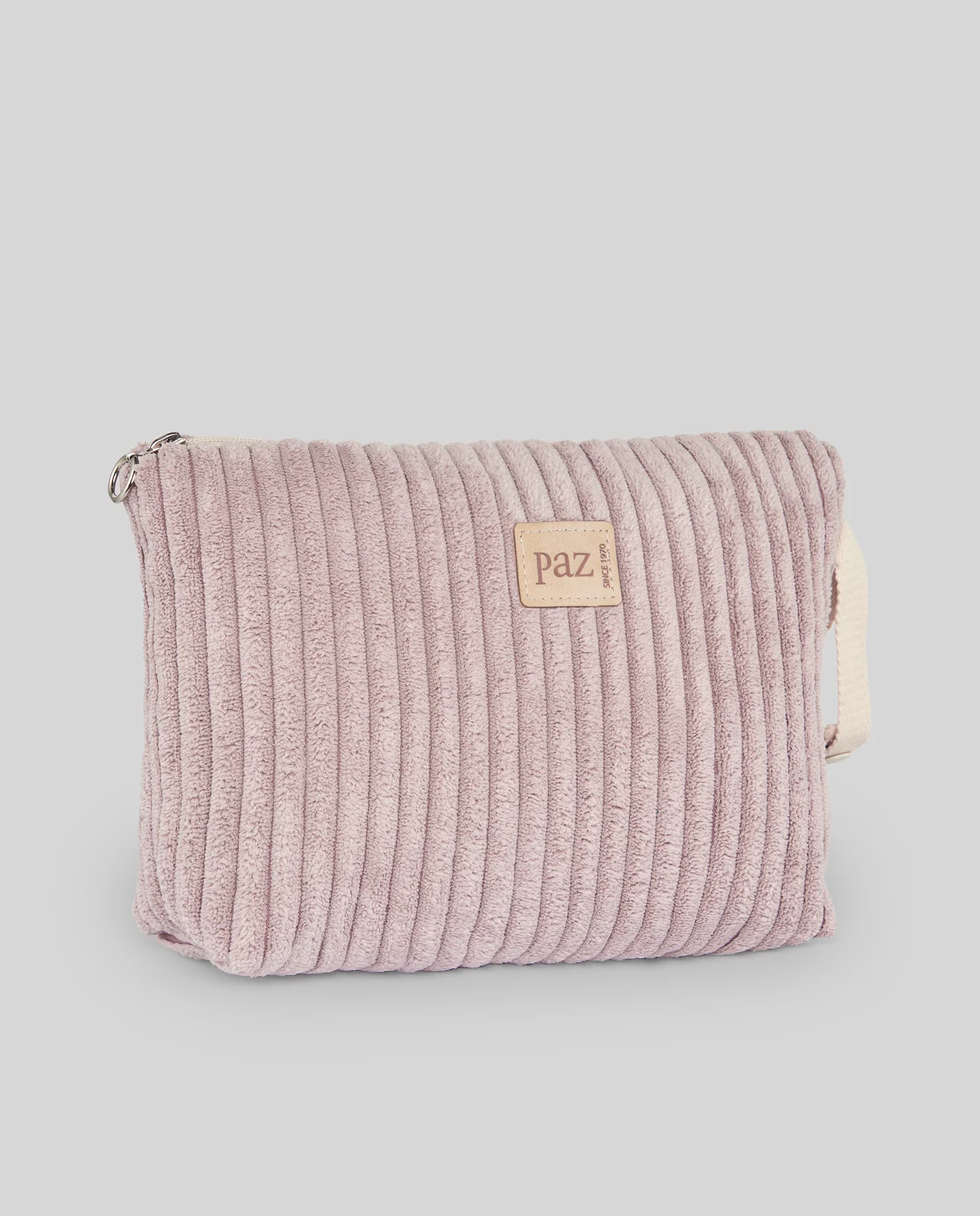 Neceser de pana con cierre mediante cremallera y con asa para colgar.