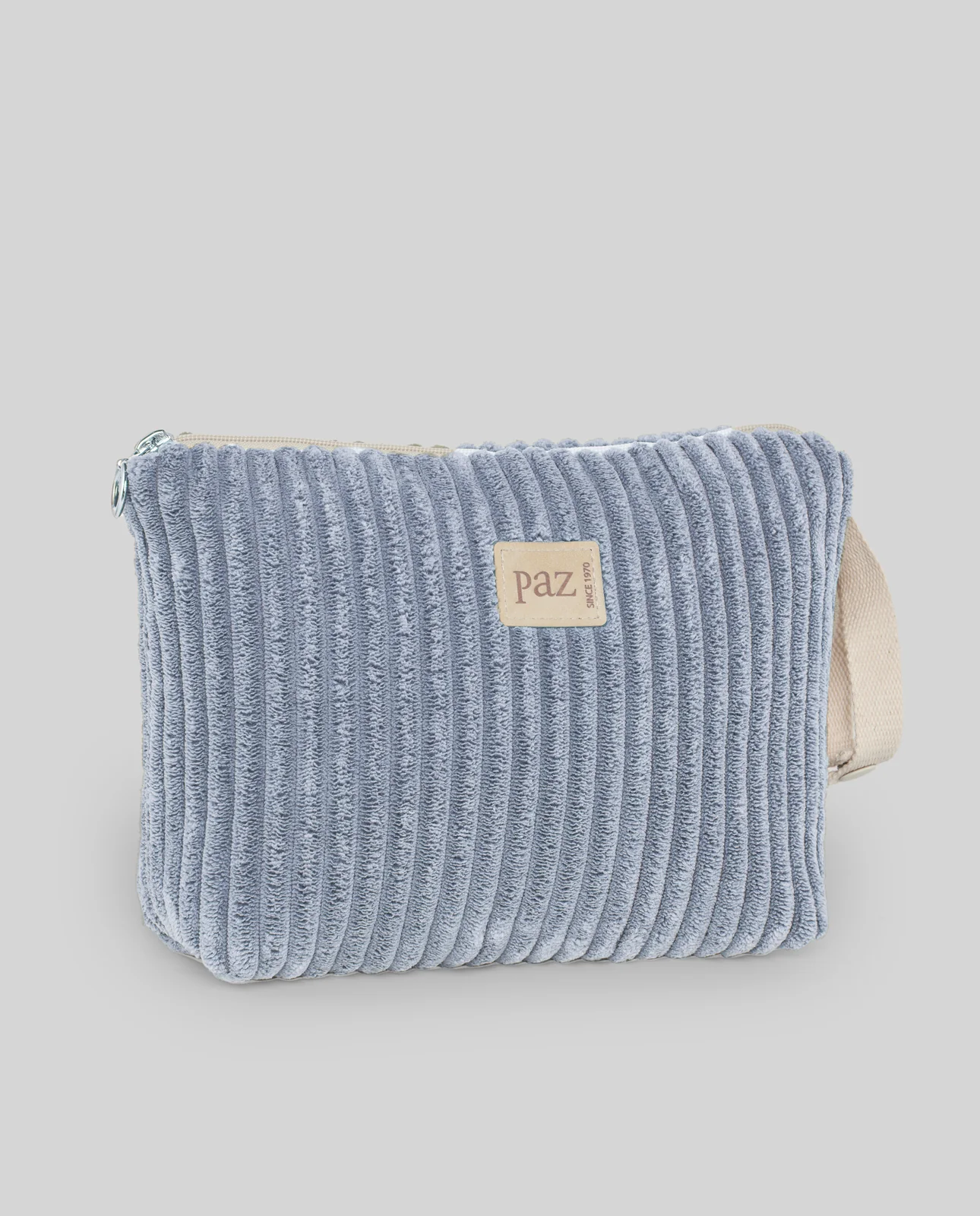 Neceser de pana con cierre mediante cremallera y con asa para colgar.