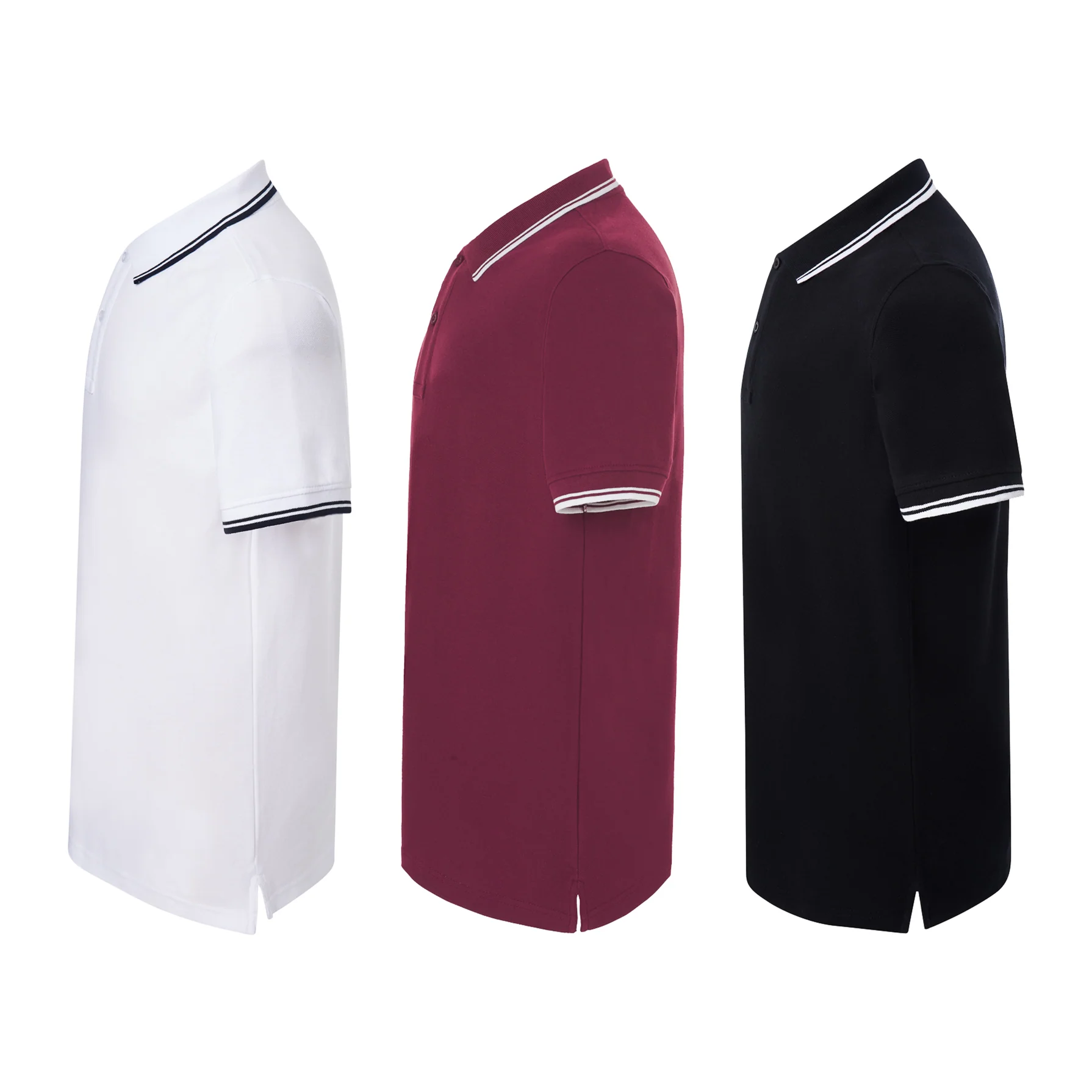 Pack de 3 Polos Básicos con rayas a contraste de color blanco, burdeos y negro. Su tejido texturizado, confeccionado en piqué de 100% algodón peinado preencogido, es duradero y cómodo.