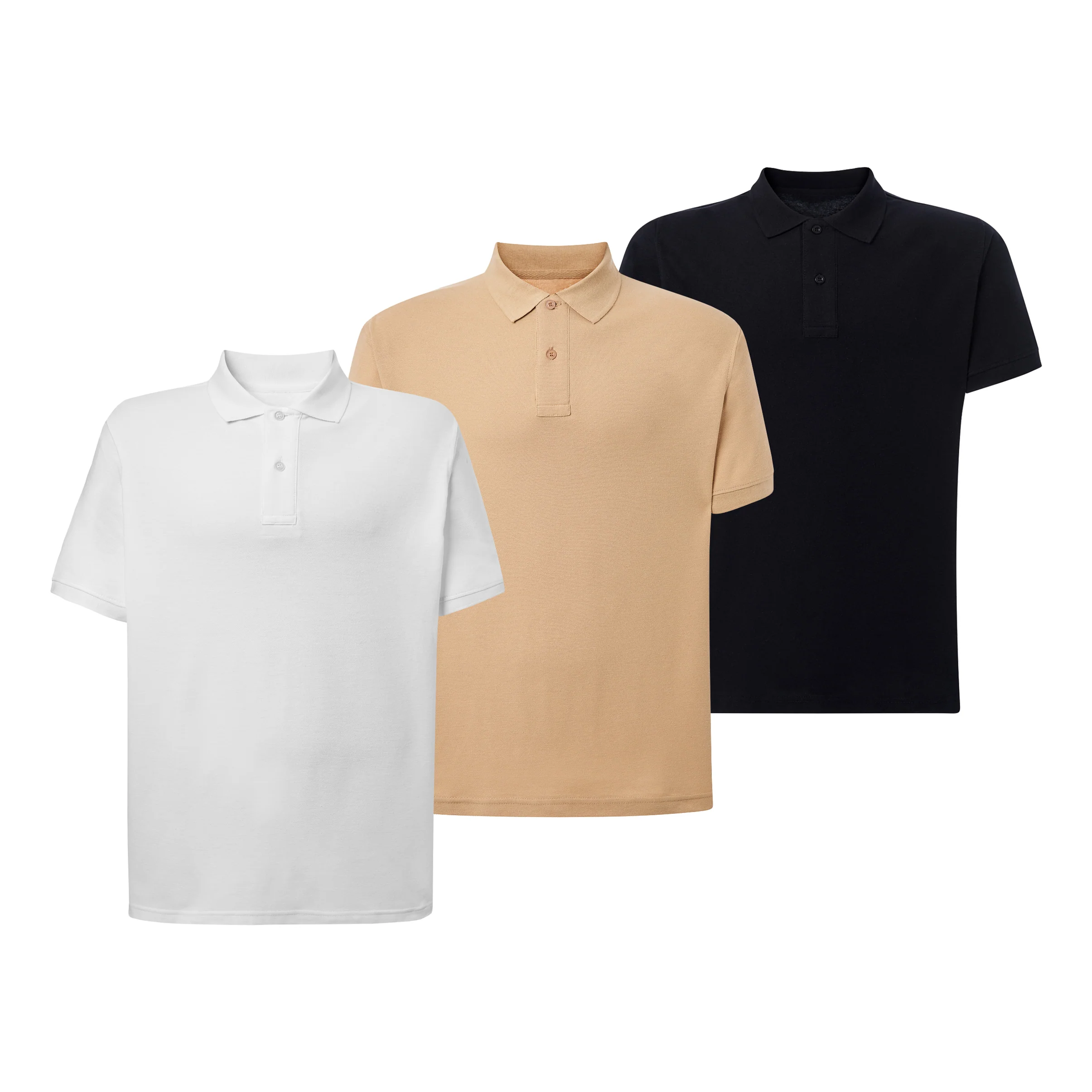 Pack de 3 Polos Básicos de color blanco, beige y negro. Su tejido texturizado, confeccionado en piqué de 100% algodón peinado preencogido, es duradero y cómodo.