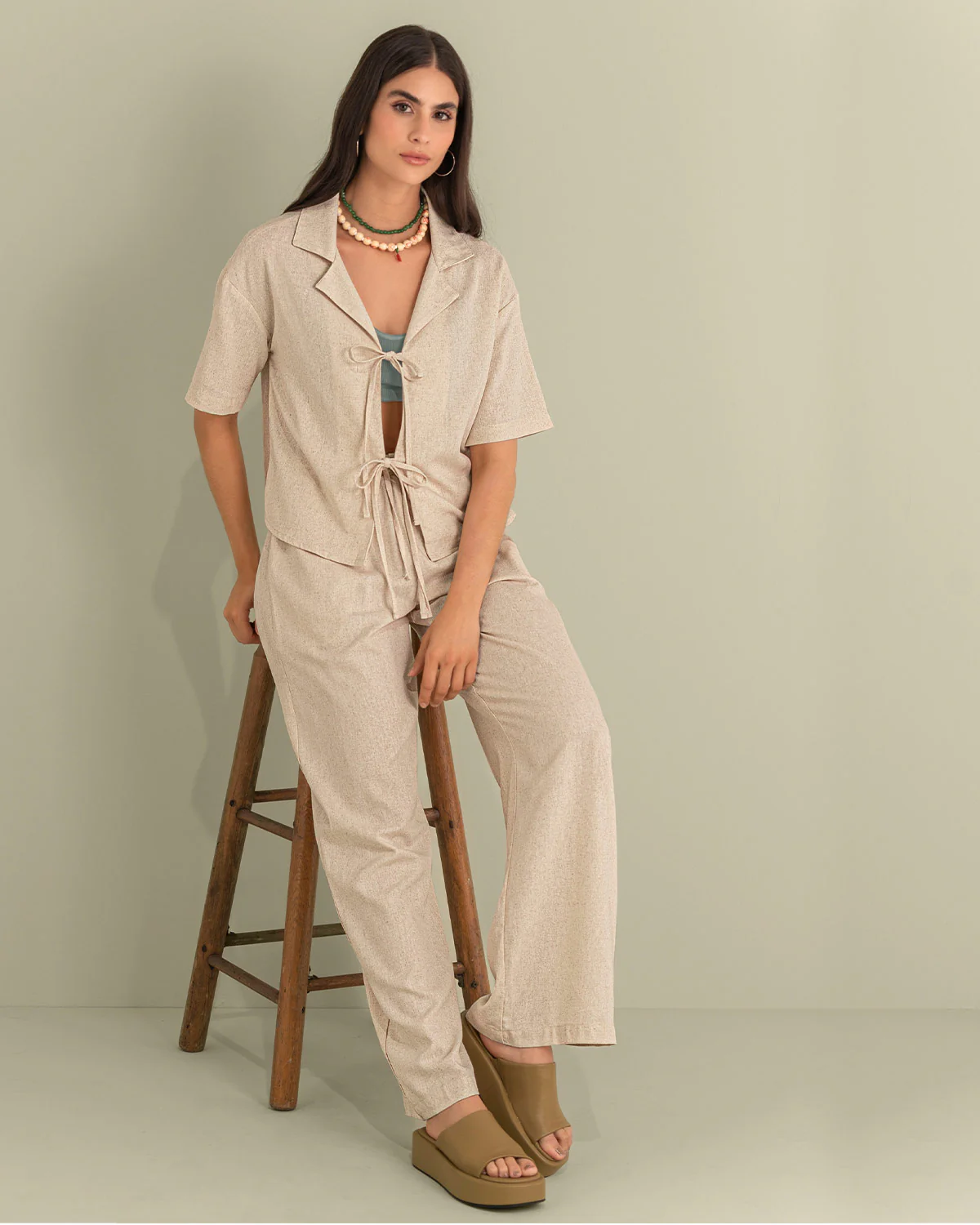 Nada se iguala con la frescura, comodidad y el estilo de estos pantalones bota recta en tela tipo lino. Esta nueva pieza, es la que le dará un sello relajado a tu día a día. Su silueta amplia y elástico en cintura te mostrarán el verdadero confort y sus bolsillos funcionales aportarán el toque práctico que no puede faltar en nuestras prendas. ¡Úsalo en set con nuestra blusa con tiras para anudar en frente de la misma tela!