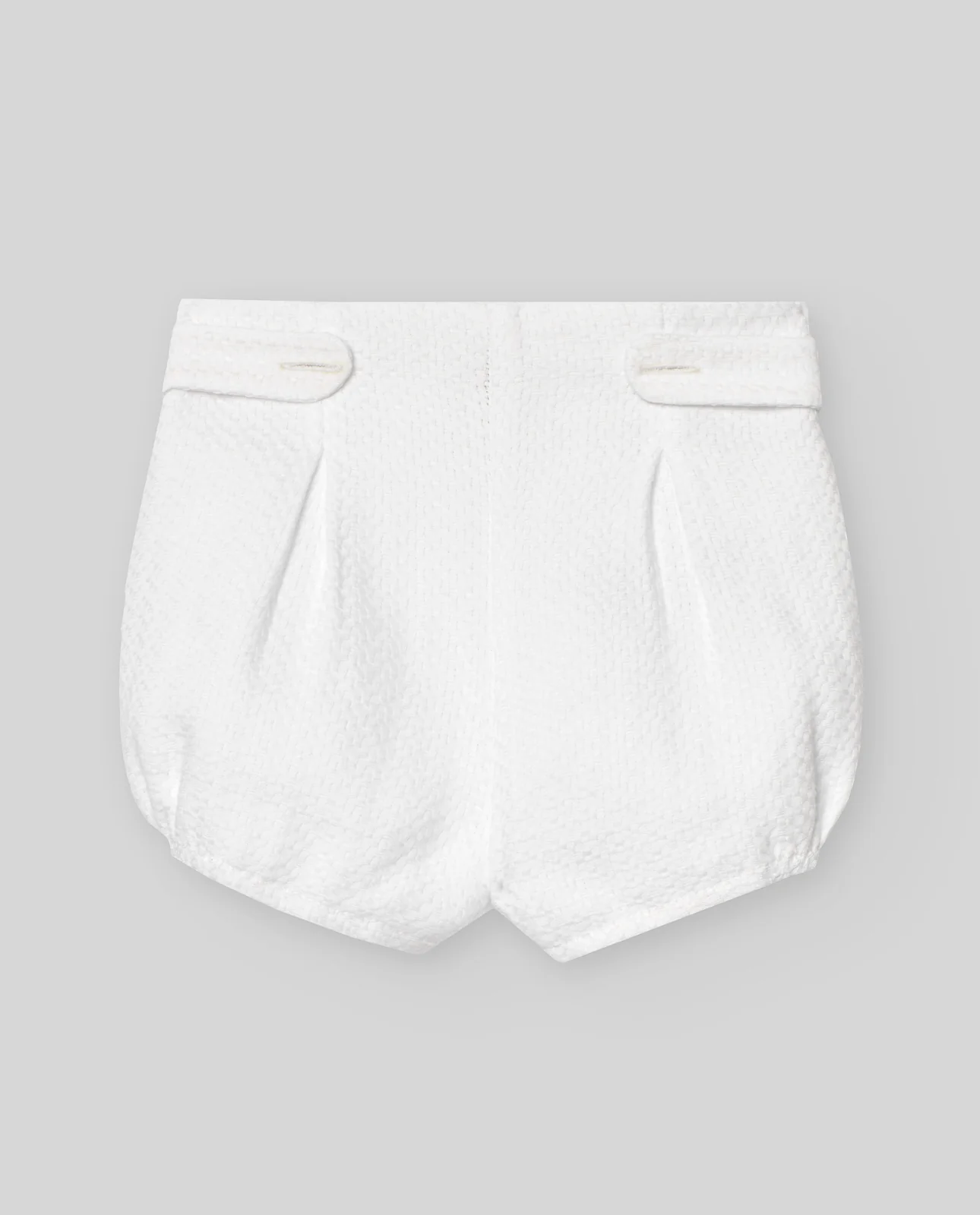 Pantalón corto de piqué con goma en lateral de la pierna tipo bombacho y pinzas delanteras.