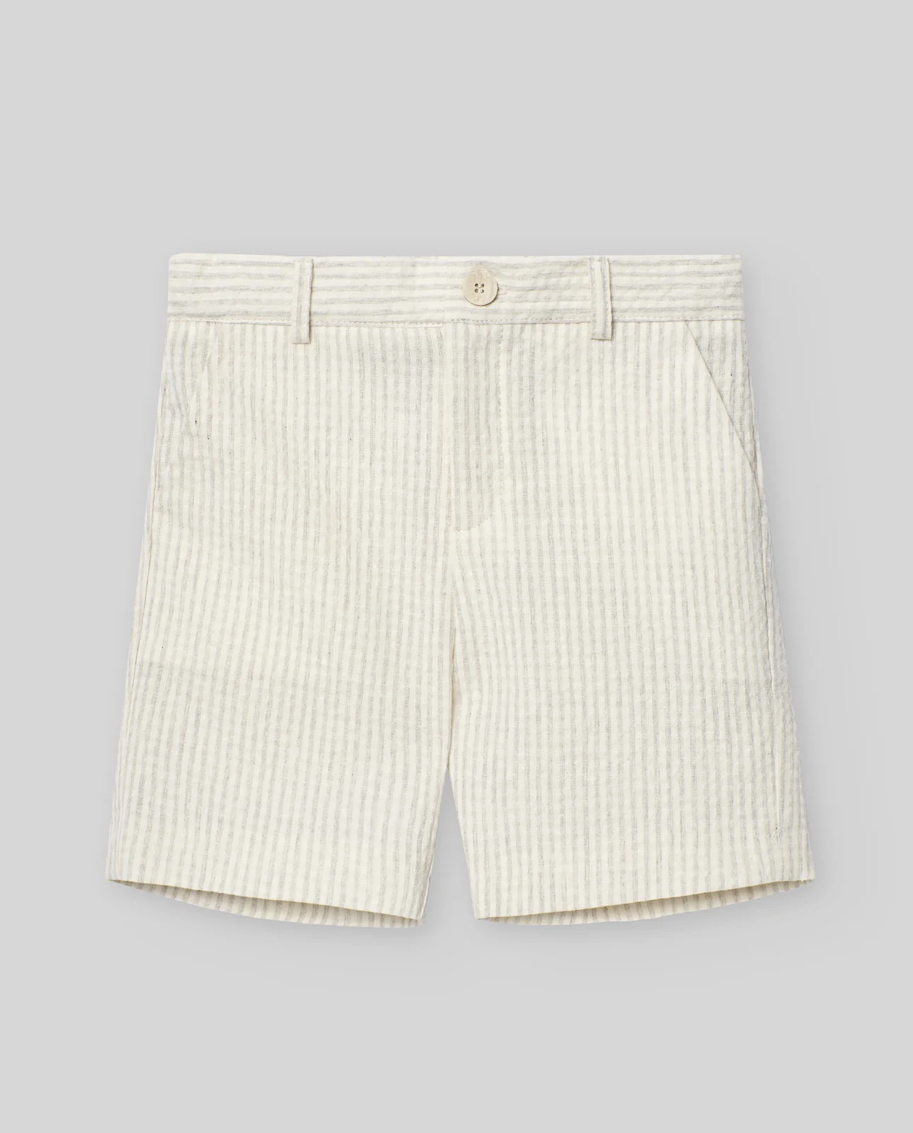 Pantalón de traje corto en seersucker en raya bicolor con bolsillo italiano.