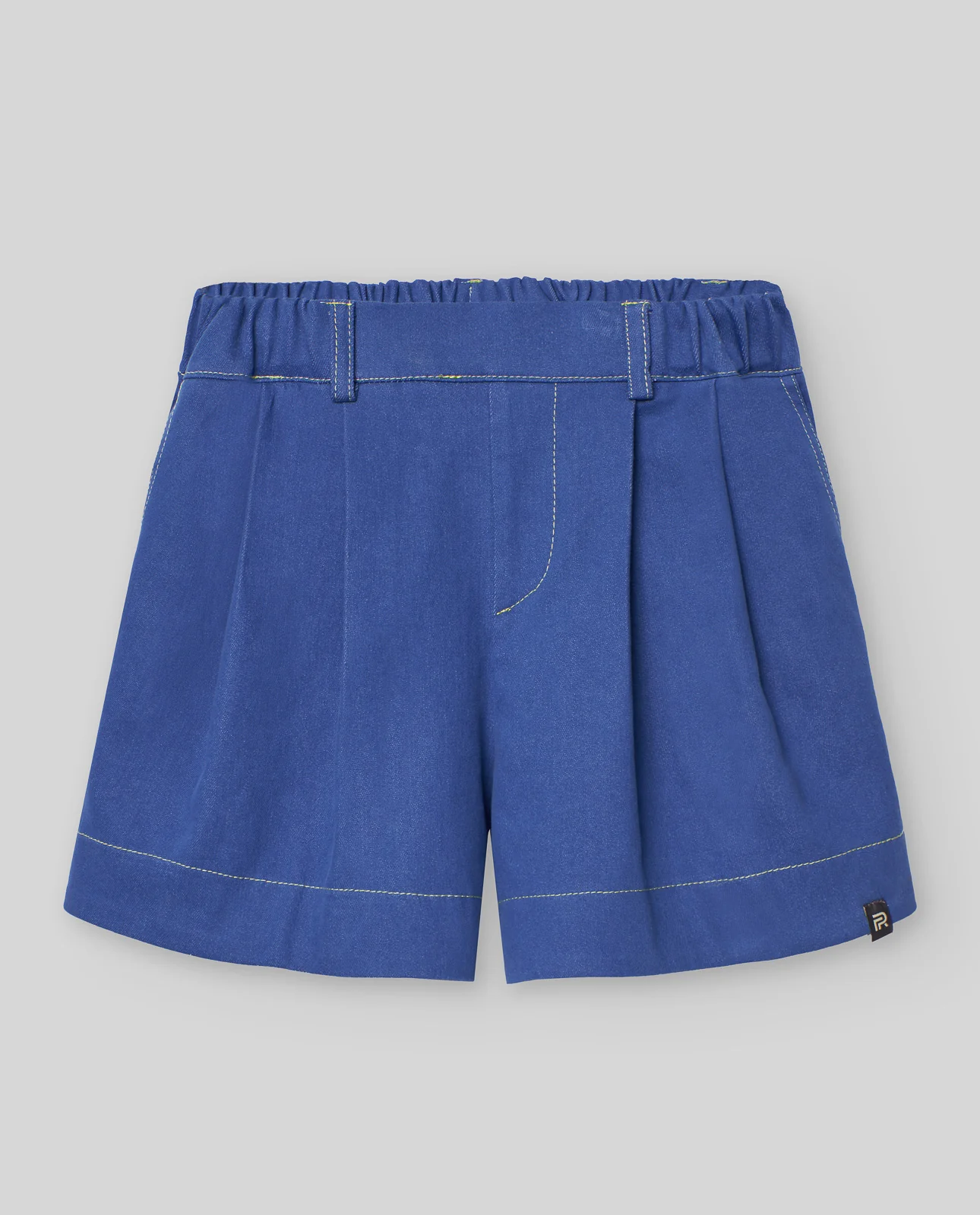 Pantalón corto estilo safari en denim con doble pliegue en delantero y corte evasé. Goma espalda y bolsillo italiano.