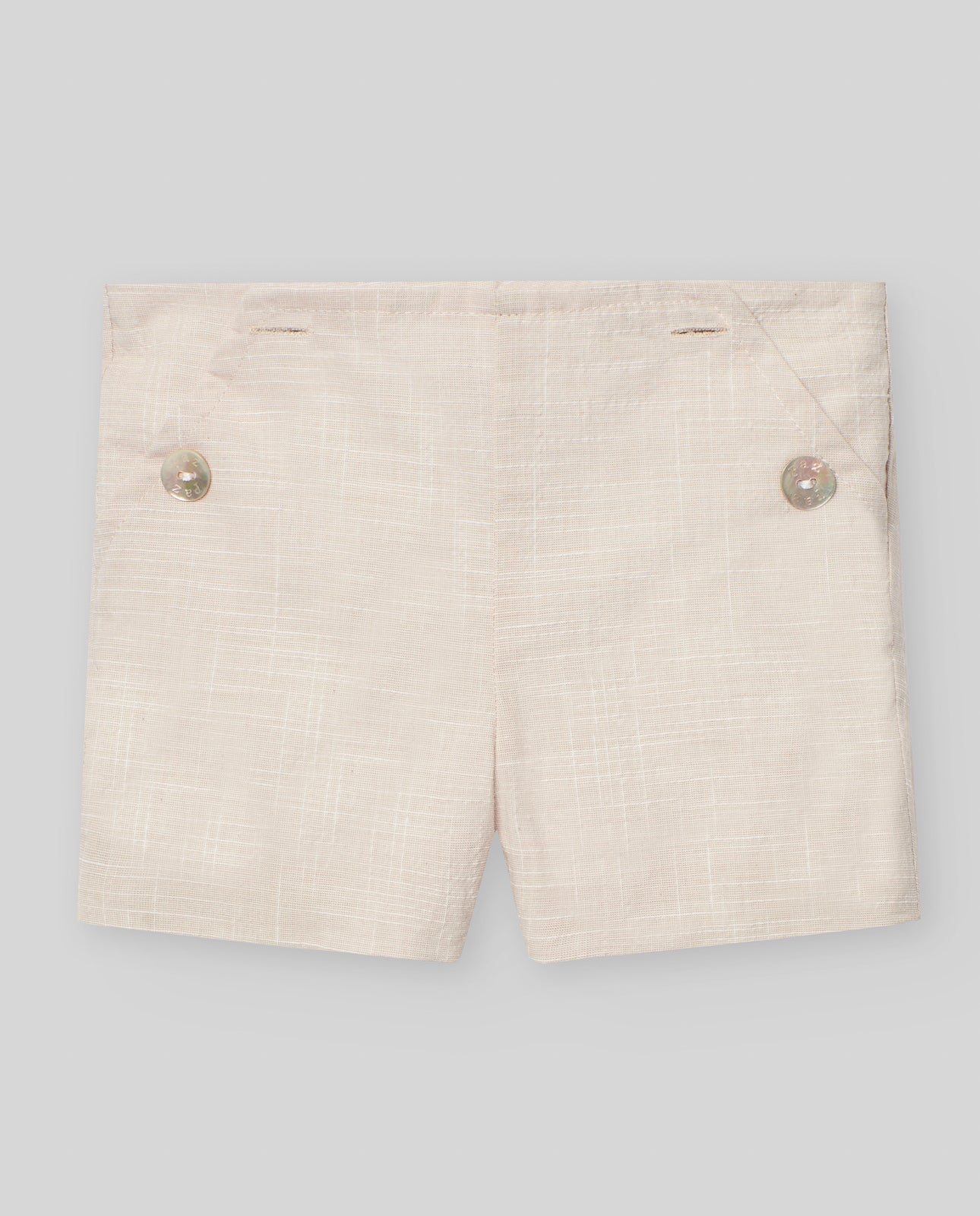 Pantalón corto lino textura rústica botones de nácar decorativos laterales.