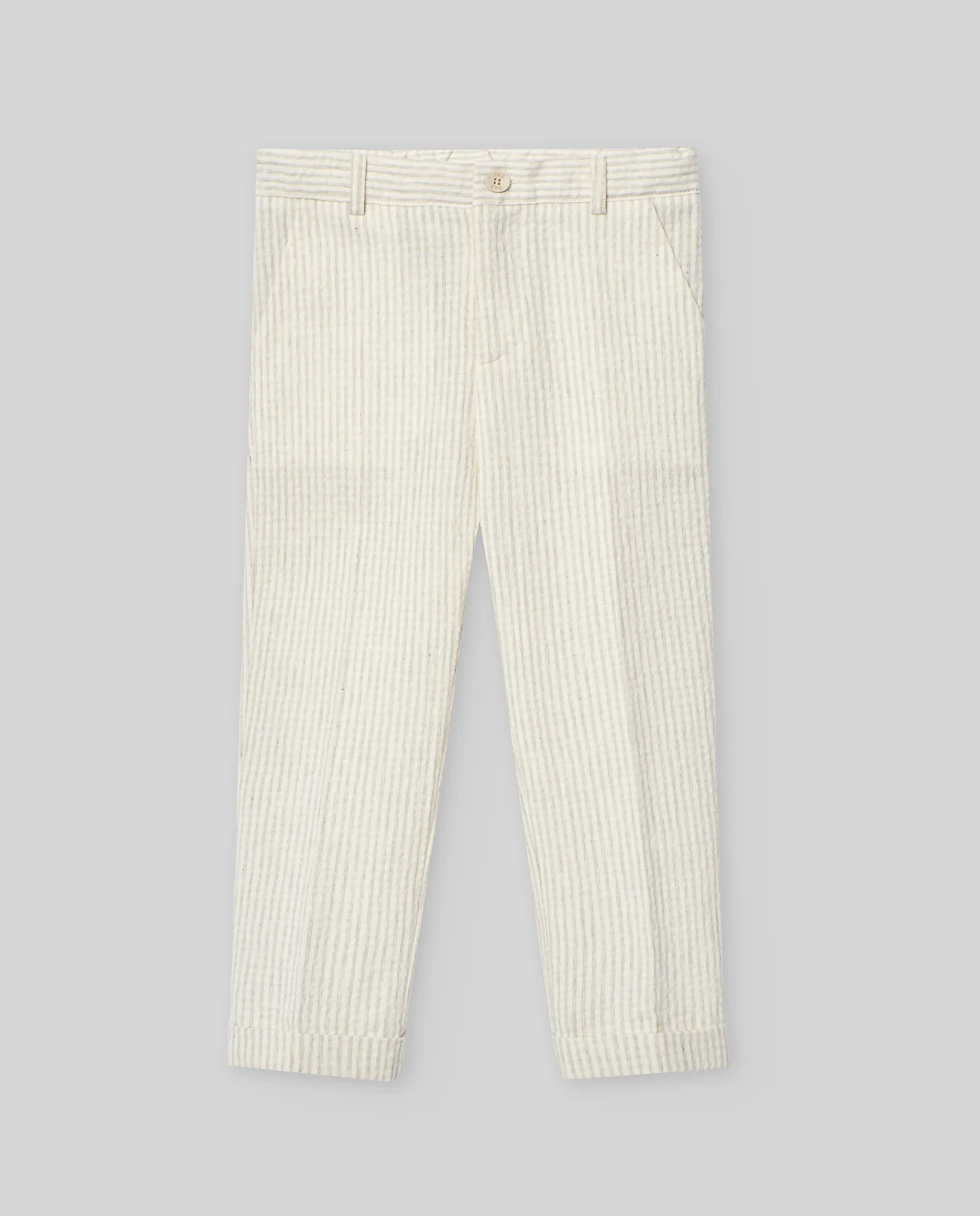 Pantalón de traje en seersucker en raya bicolor con vuelta en bajo y bolsillo italiano.