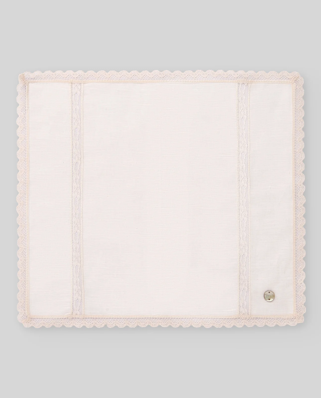 Pañuelo para bautizo en color crudo. Es de lino-algodón acabado en puntilla y su medida es de 33×30 centímetros.