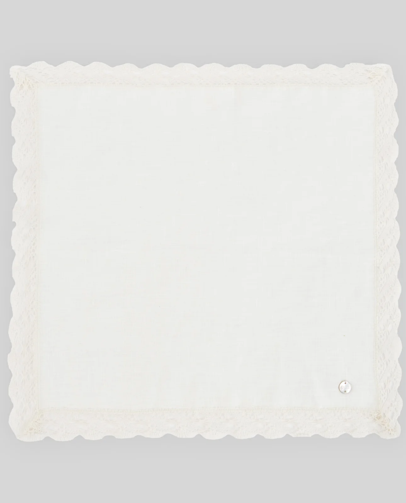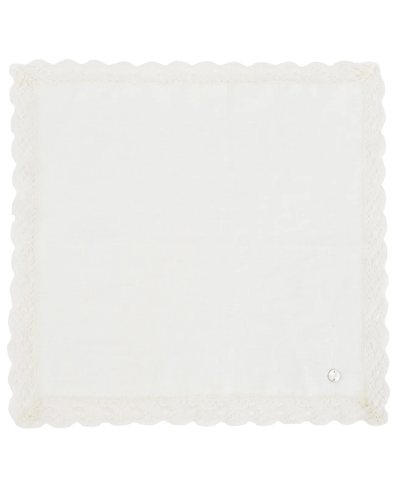Pañuelo cuadrado de lino con puntilla de encaje, ideal para bautizos u ocasiones especiales. Con un acabado delicado, forma parte de la colección ESENCIAL.
