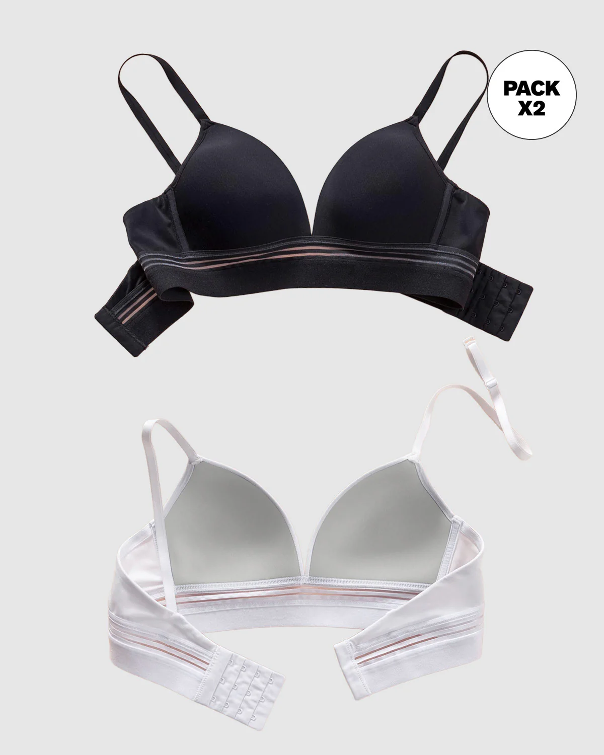 ¡Uno de nuestros brasieres más vendidos, ahora en paquete x 2! Este brasier es la comodidad hecha prenda ya que es muy liviano y ligero y sus cargaderas son ultrasuaves. Sus copas fijas en espuma hacen que tu busto luzca más redondeado y a la vez natural. Lo mejor de todo es que tiene un escote profundo, para que puedas usarlo con prendas muy escotadas y aún así lucir perfecta. Bajo el busto, tiene unas franjas en transparencias que le dan un toque absolutamente irresistible y un elástico ancho en la base, te ayuda a soportar tu busto cómodamente. ¡Y si te gusta qué mejor que llevarlo x 2!