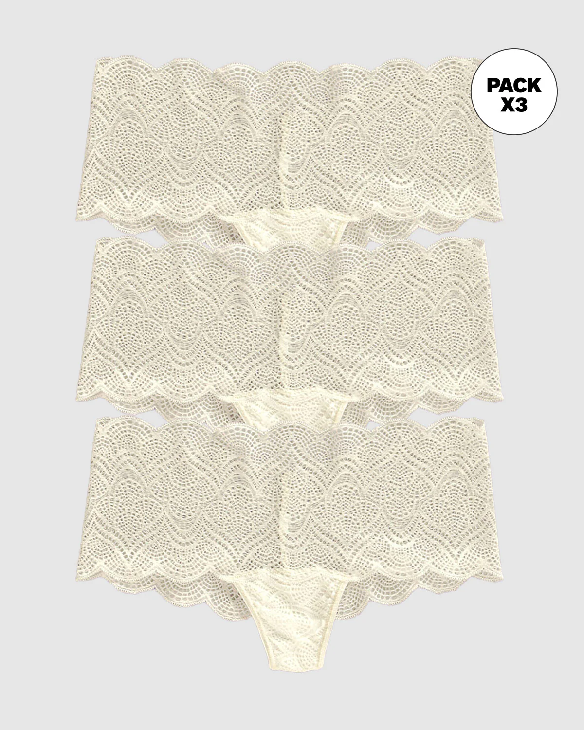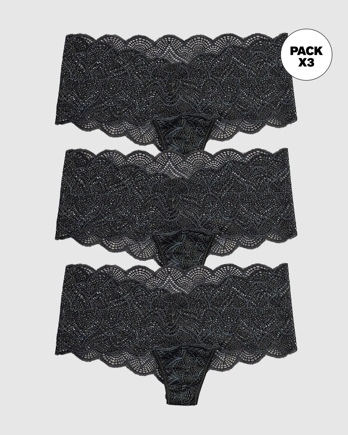 Siéntete ligera y sexy con este paquete x 3 panties estilo cachetero. Se ajustan cómodamente a tu cuerpo. Están elaborados en un delicado encaje elástico con transparencias y detalles de moras (bordes redondeados), para una apariencia femenina y romántica. No tienen elásticos en piernas ni cintura para que te sientas más libre ¡la comodidad en la ropa interior es lo primero! El corte en el centro de los glúteos les da una modelación más natural y su refuerzo interno en algodón te hará sentir muy fresca. Son perfectos para el día a día o para cualquier momento en el que quieras sentirte espectacular en tu ropa interior. Llévalos en paquete x 3.