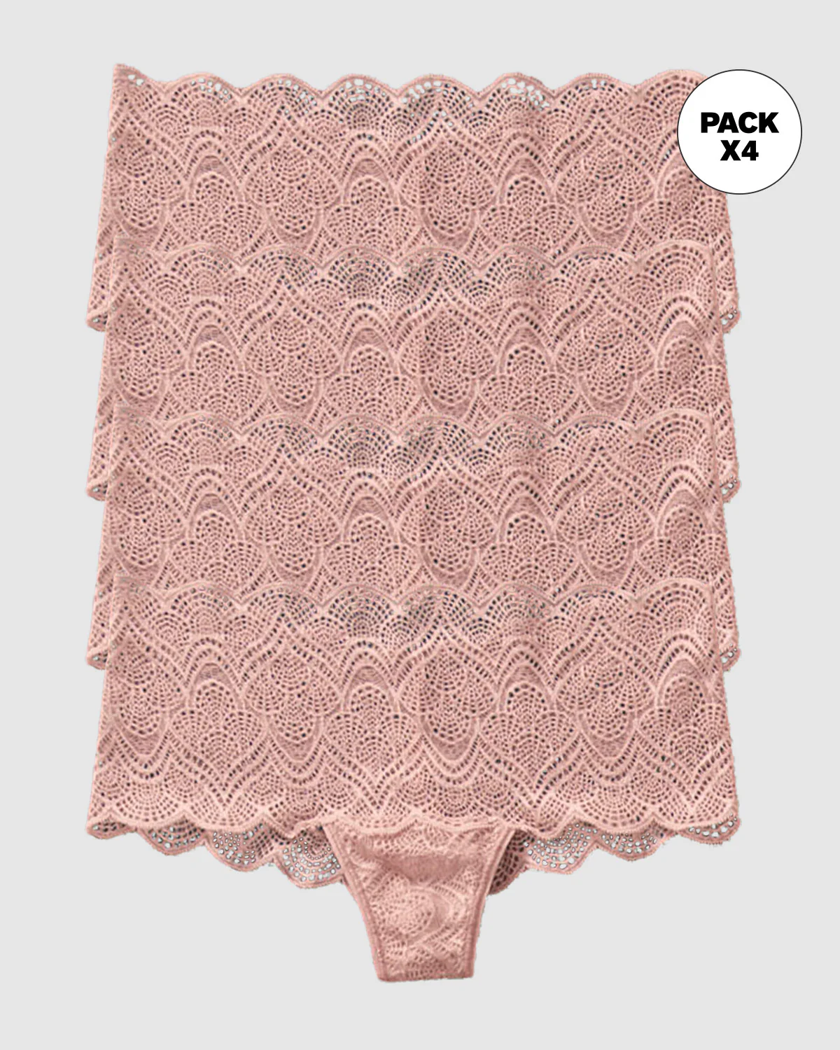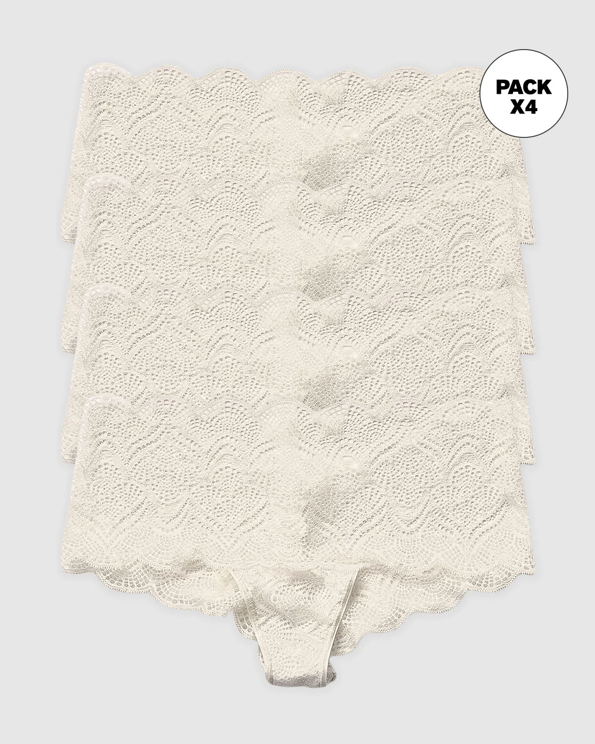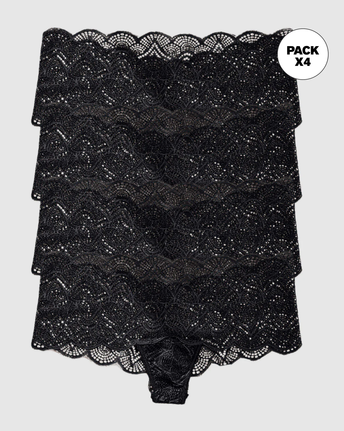 Siéntete ligera y sexy con este paquete x 3 panties estilo cachetero. Se ajustan cómodamente a tu cuerpo. Están elaborados en un delicado encaje elástico con transparencias y detalles de moras (bordes redondeados), para una apariencia femenina y romántica. No tienen elásticos en piernas ni cintura para que te sientas más libre ¡la comodidad en la ropa interior es lo primero! El corte en el centro de los glúteos les da una modelación más natural y su refuerzo interno en algodón te hará sentir muy fresca. Son perfectos para el día a día o para cualquier momento en el que quieras sentirte espectacular en tu ropa interior. Llévalos en paquete x 4.