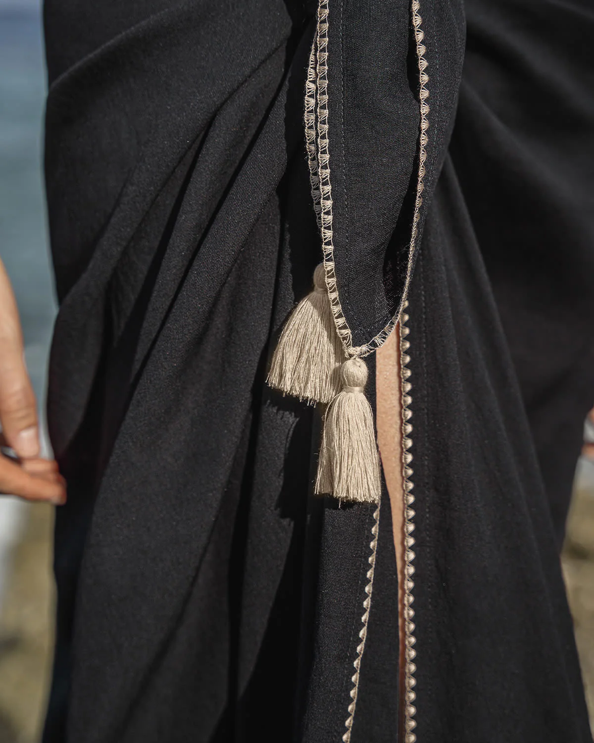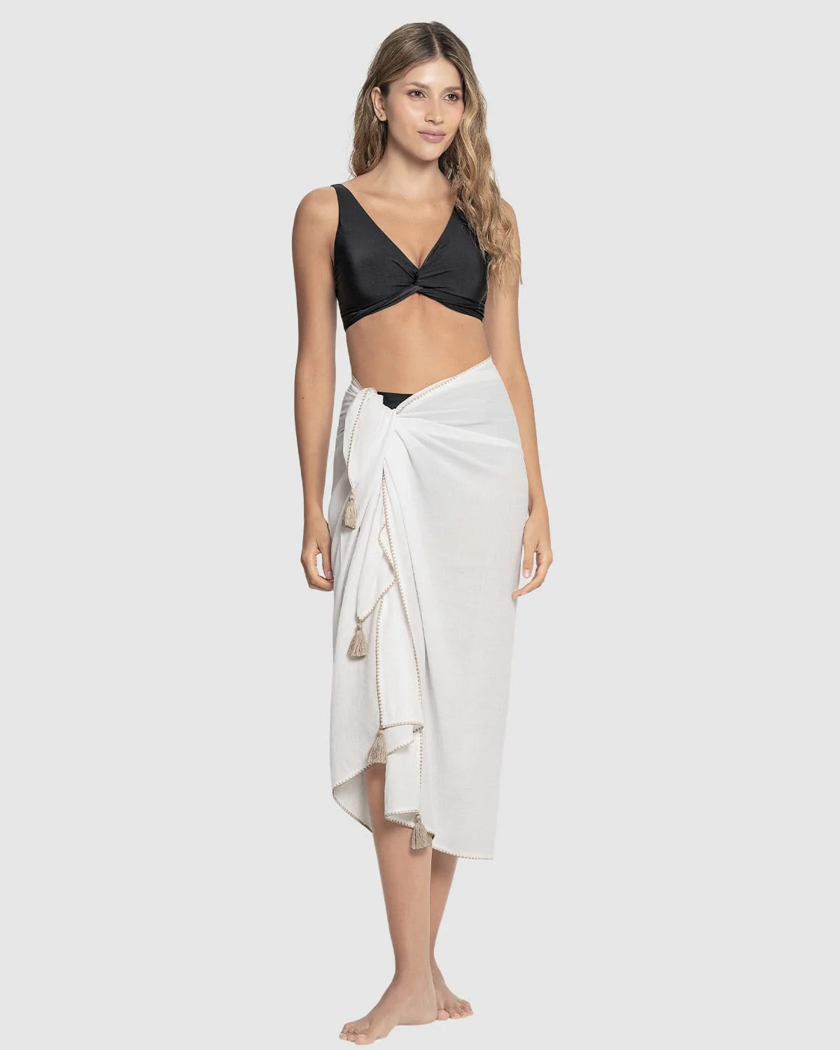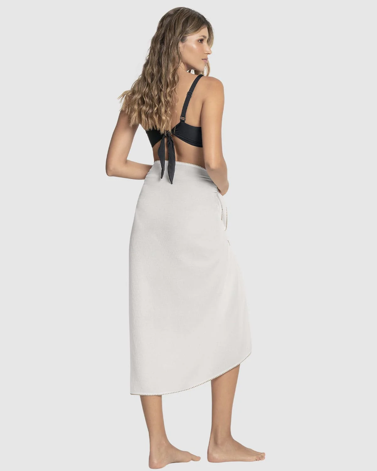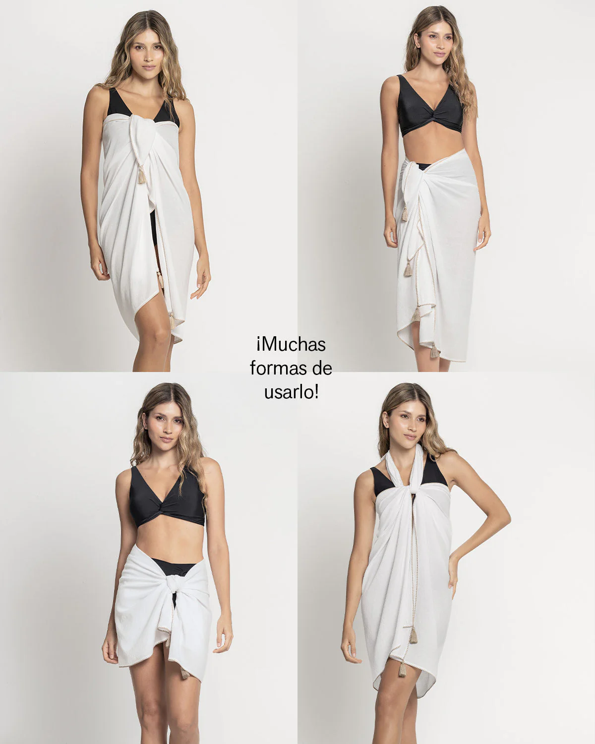 Que algo sea versátil siempre será una ventaja. Con este pareo harás que tus looks playeros se multipliquen: puedes usarlo como falda larga o corta, como vestido anudado al cuello o como strapless e incluso para acostarte sobre él cuando estés en la playa o en una silla recibiendo el sol. Sus detalles decorativos de costuras en el borde y de pompones en las puntas, le dan ese toque diferenciado y sofisticado que tanto te gusta.
