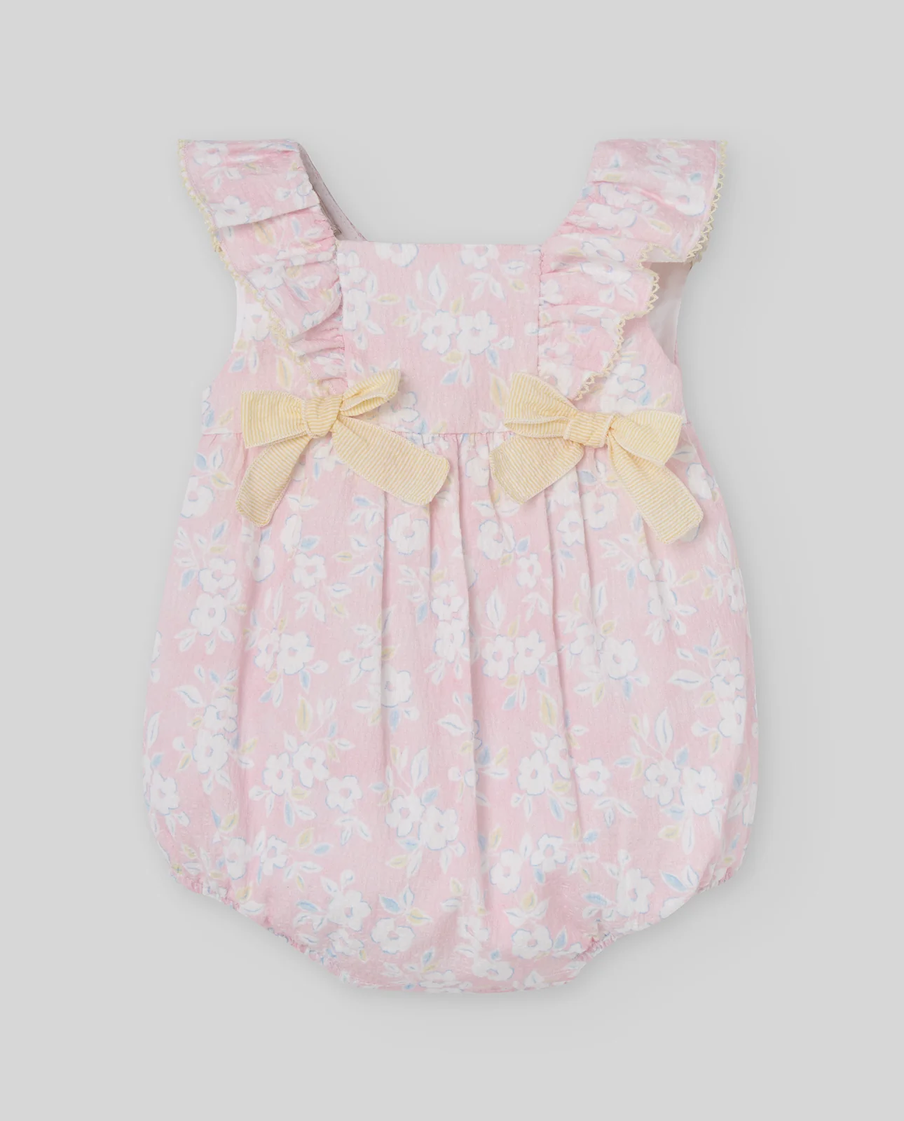 Pelele de tejido estampado para bebé niña con volantes en los hombros y lazos decorativos. Su confección cuidada aporta dulzura y estilo clásico.