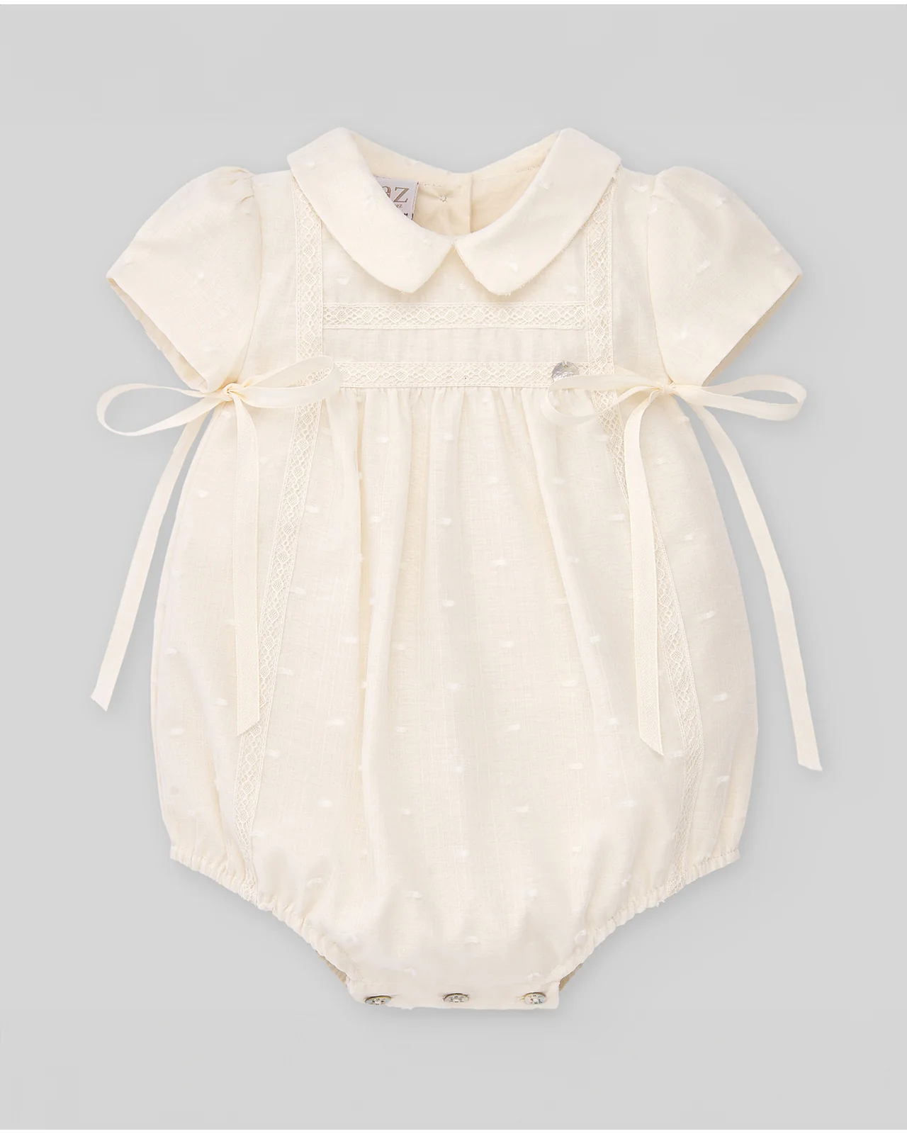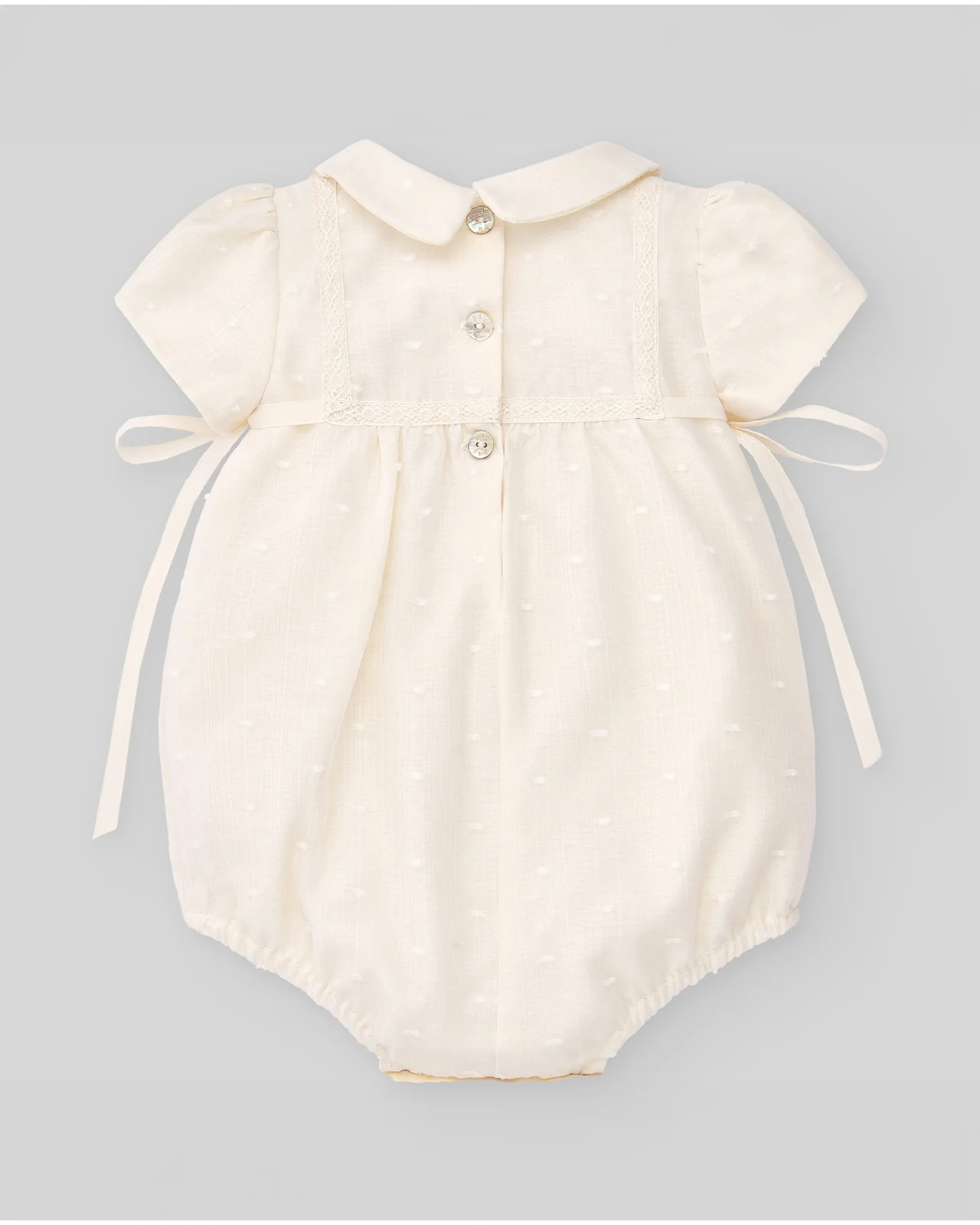 Pelele de muselina con detalle plumeti, cuello decorativo y manga corta. Cierre trasero con botones y entrepierna con corchetes.