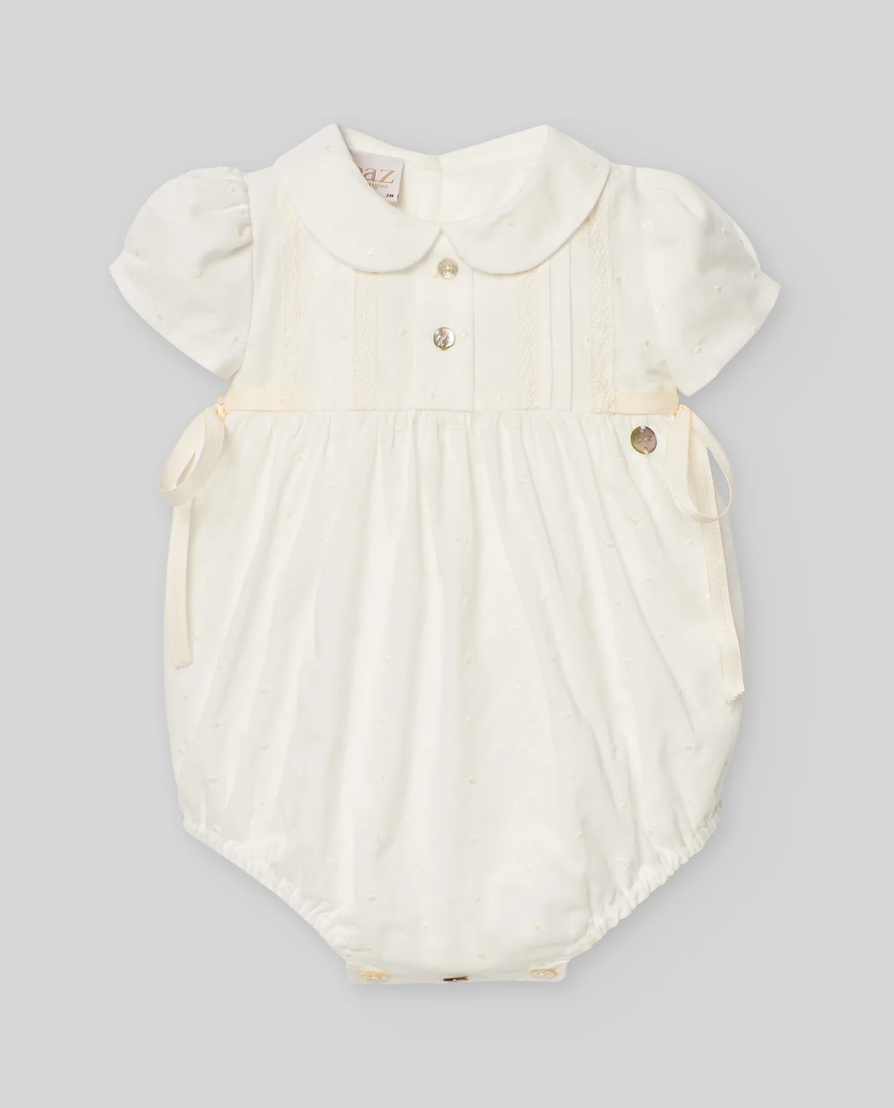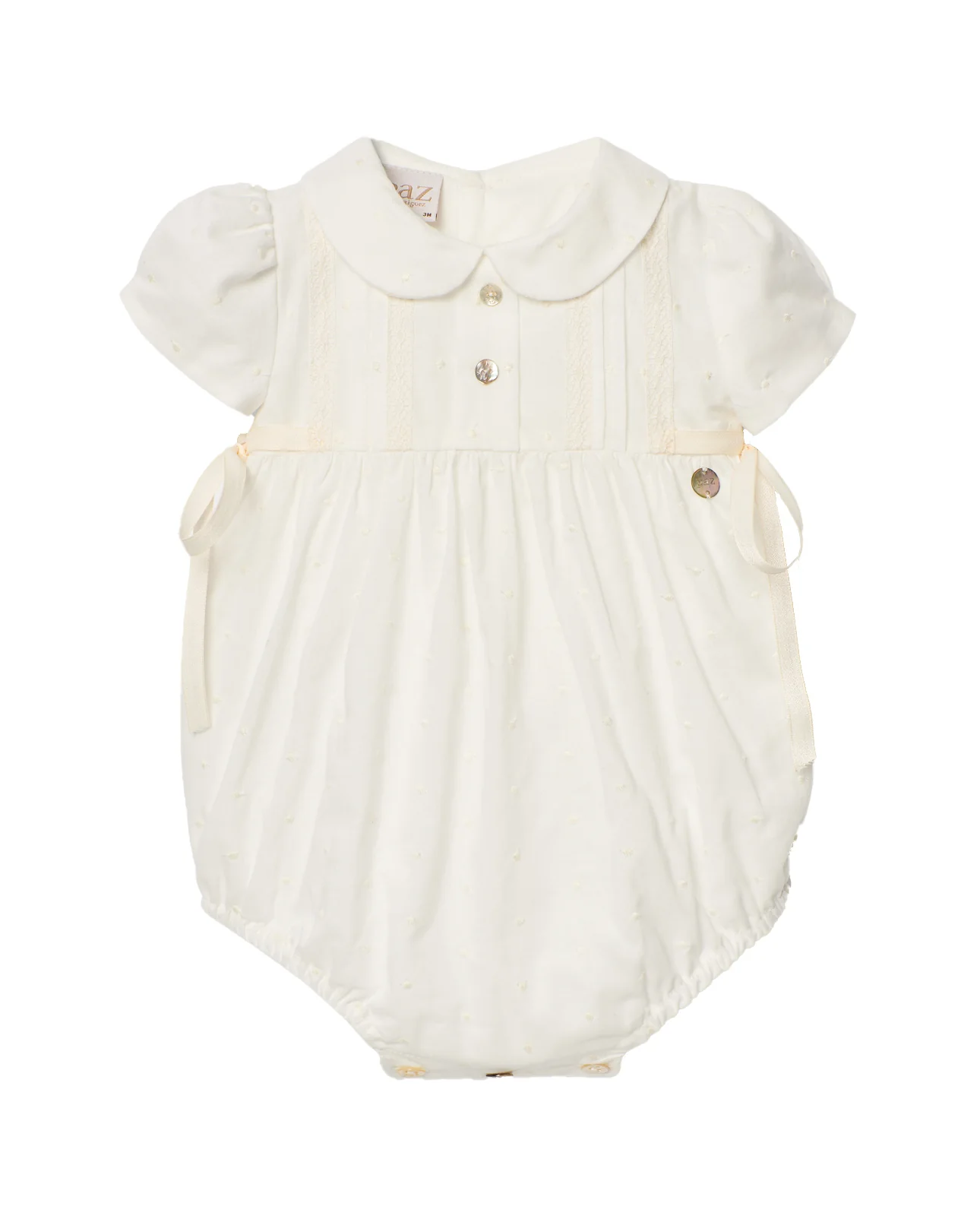 Un encantador pelele en marfil para bebé de PAZ Rodríguez. Ideal para bautizo, ceremonia o eventos especiales. Tejido con bodoques bordados y botones decorativos en el delantero. Esta pieza única tiene un cuello redondeado de estilo Peter Pan, ribetes de encaje, plumeti y lazos decorativos en ambos lados. Hay botones en la parte trasera y entre las piernas para vestir y cambiar fácilmente. Está completamente forrado para mayor comodidad.