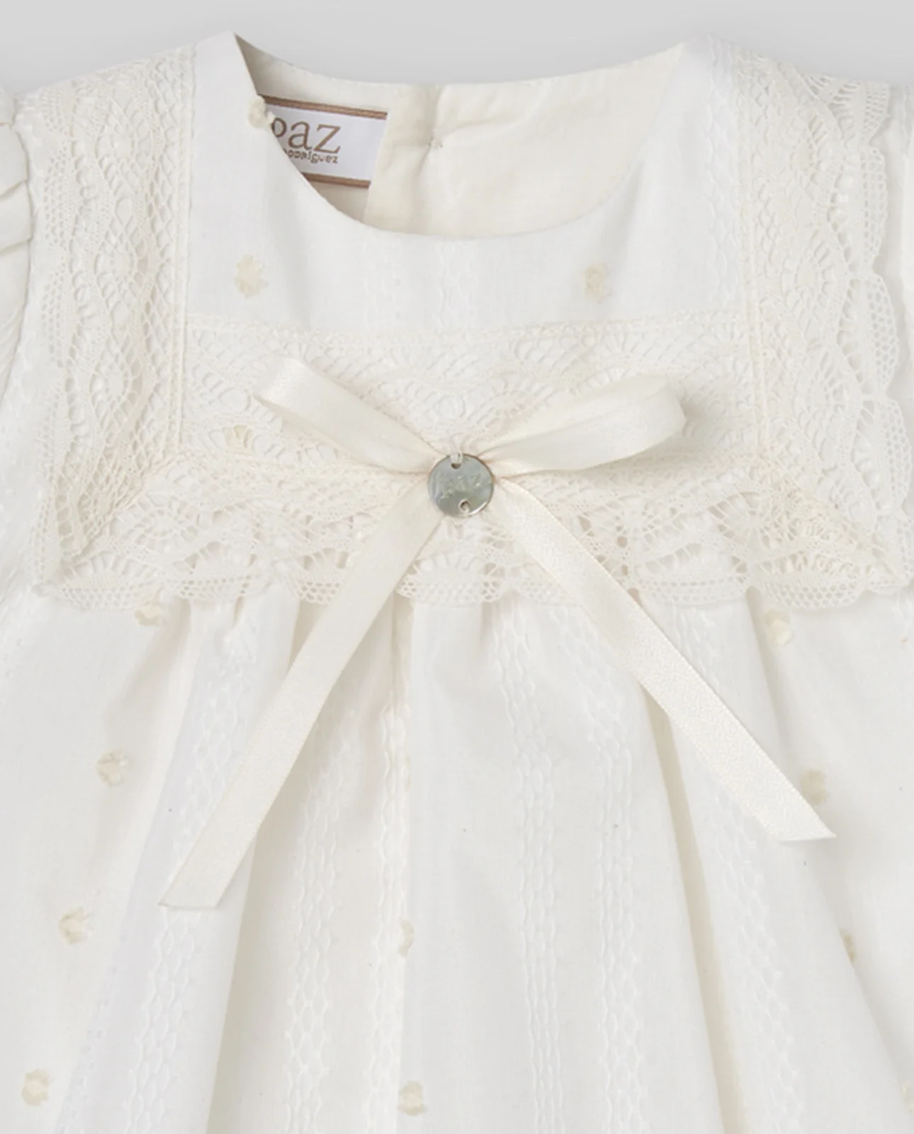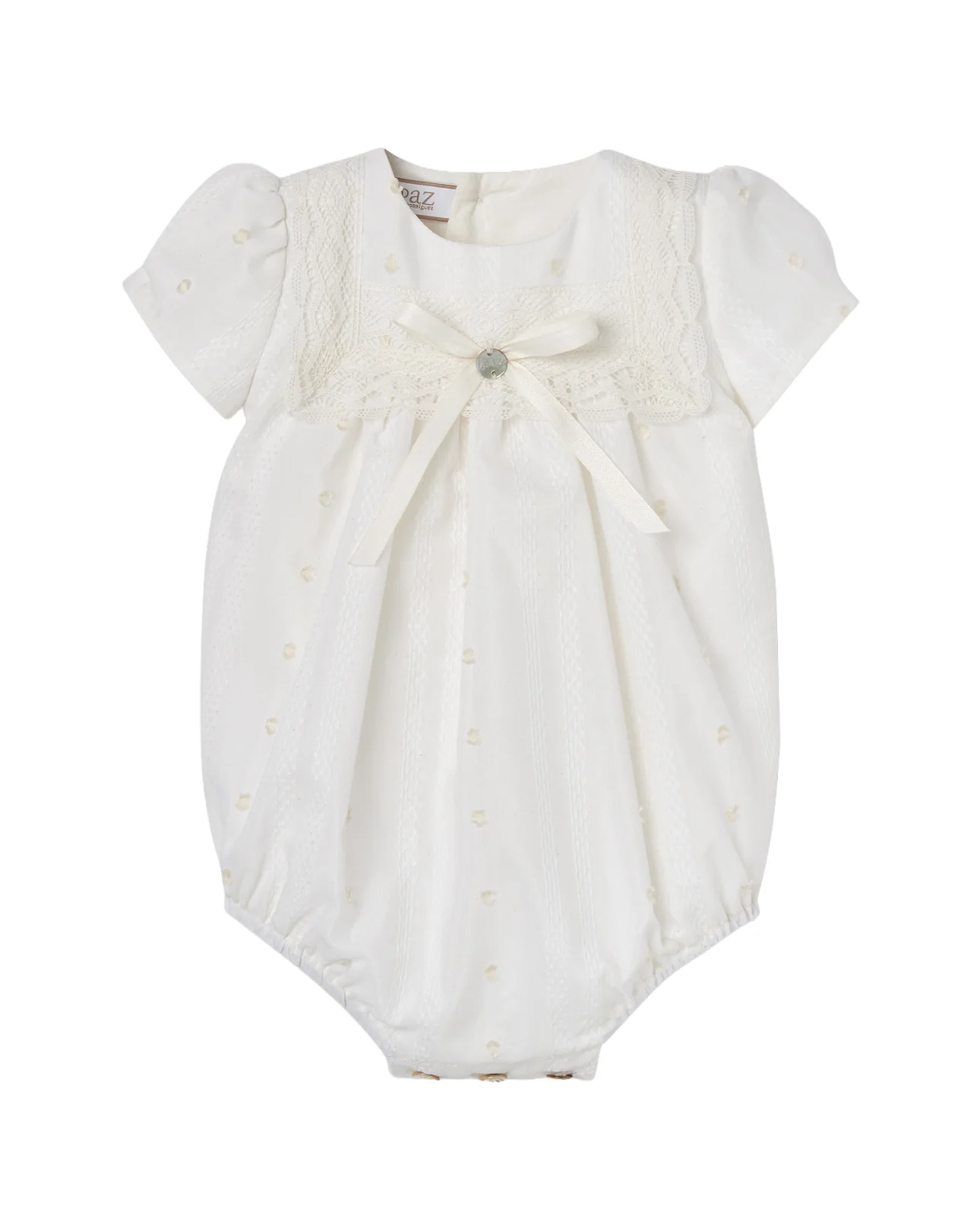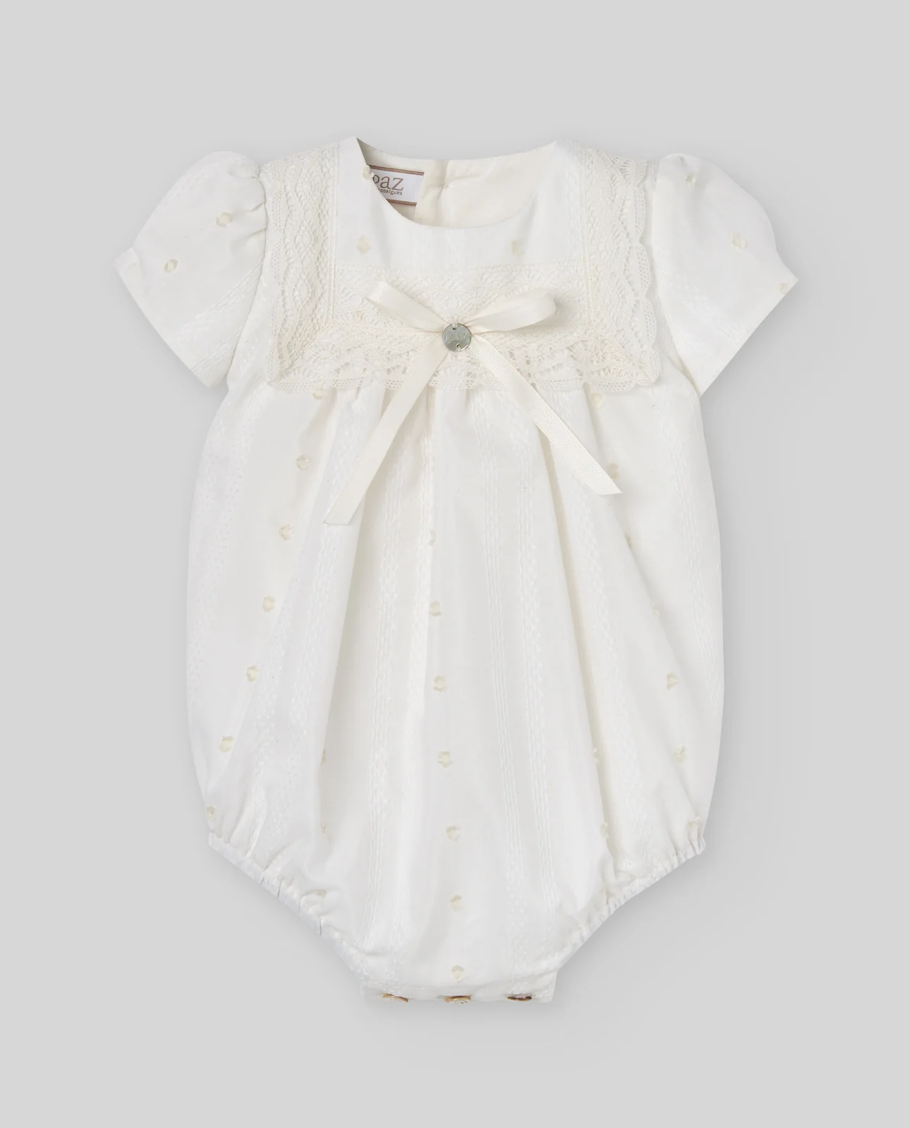 Pelele de ceremonia para bebé niña confeccionado en tejido bordado con puntilla y lazada delantera. Su diseño delicado y elegante es ideal para ocasiones especiales o bautizo.