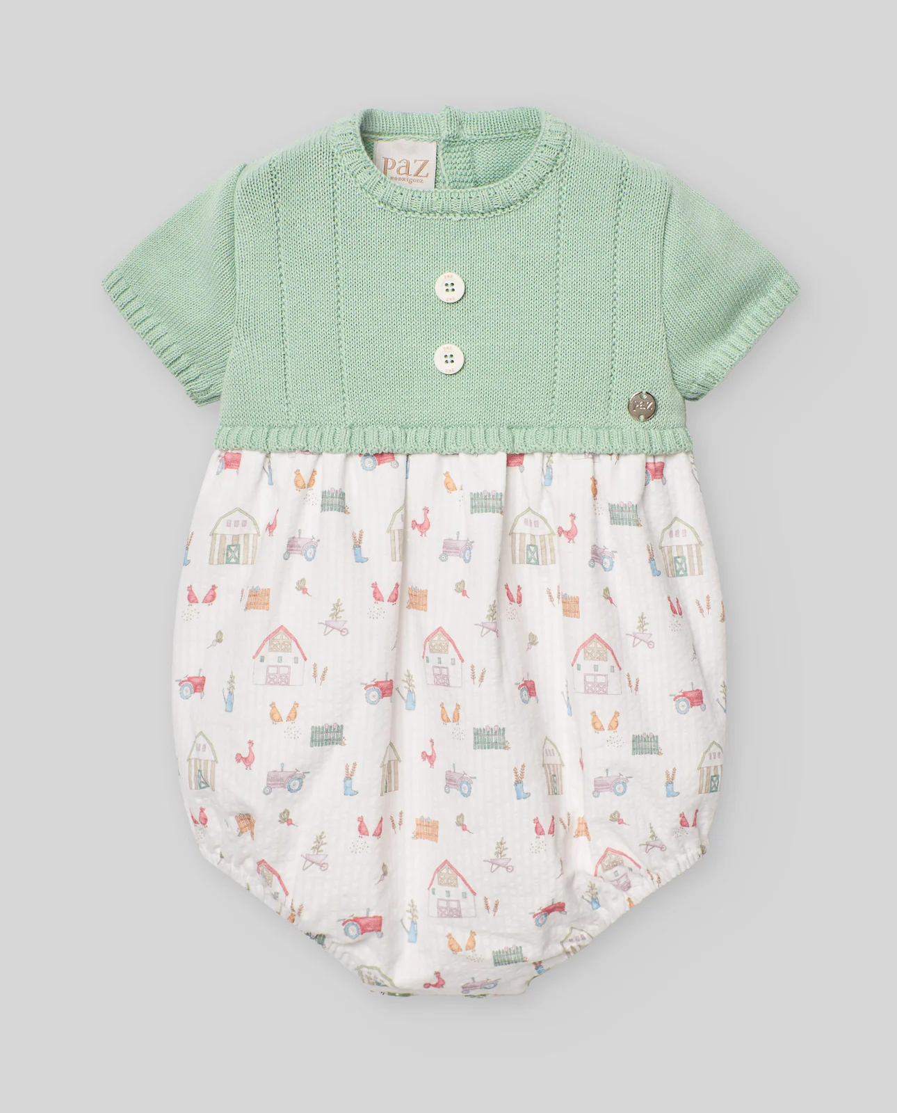 Pelele punto tela combinado con seersucker estampado con motivo de granja multicolor.