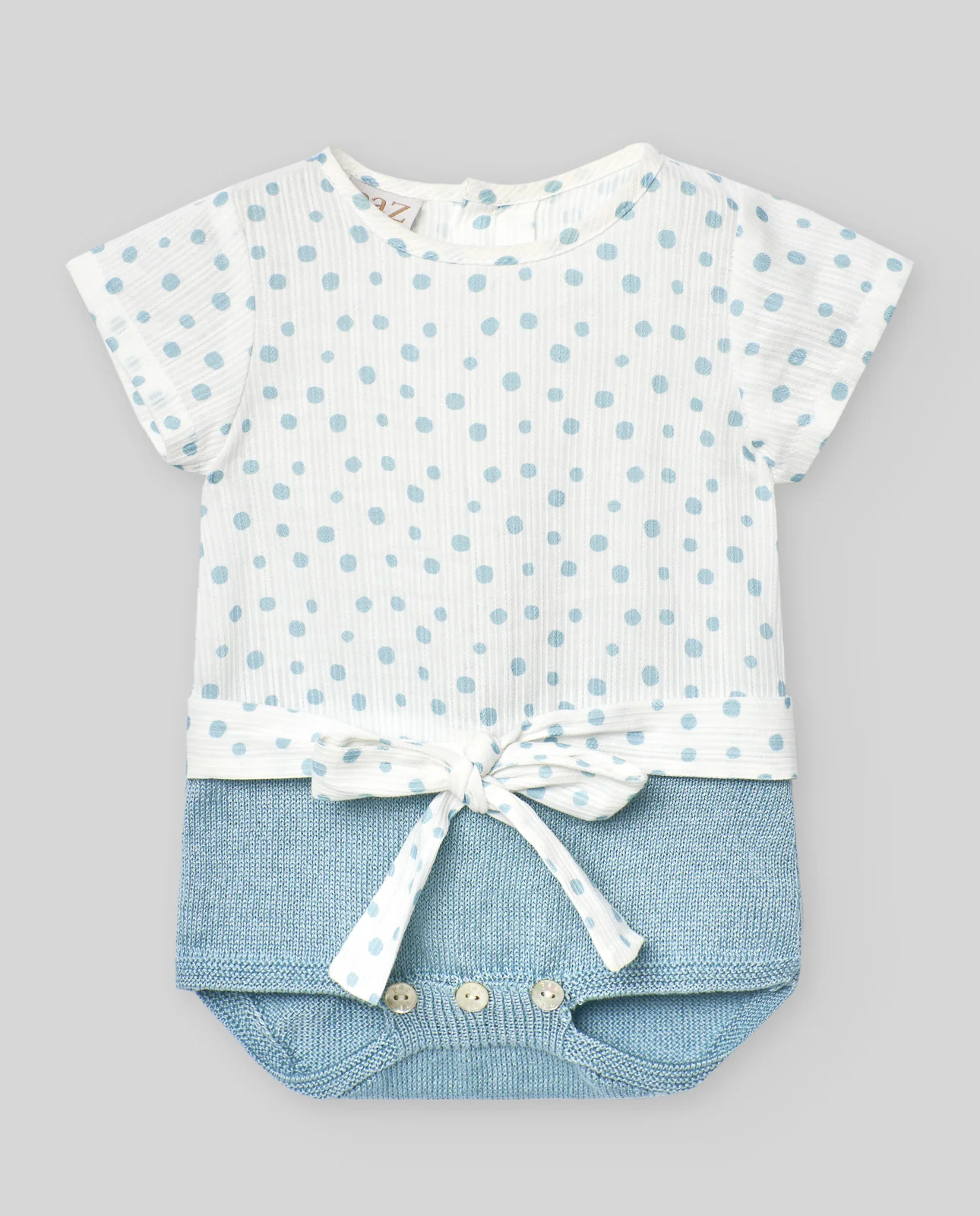 Pelele punto tela combinado con base jaquard vertical estampada con motivo de topitos, tiro bajo y lazada en cintura.