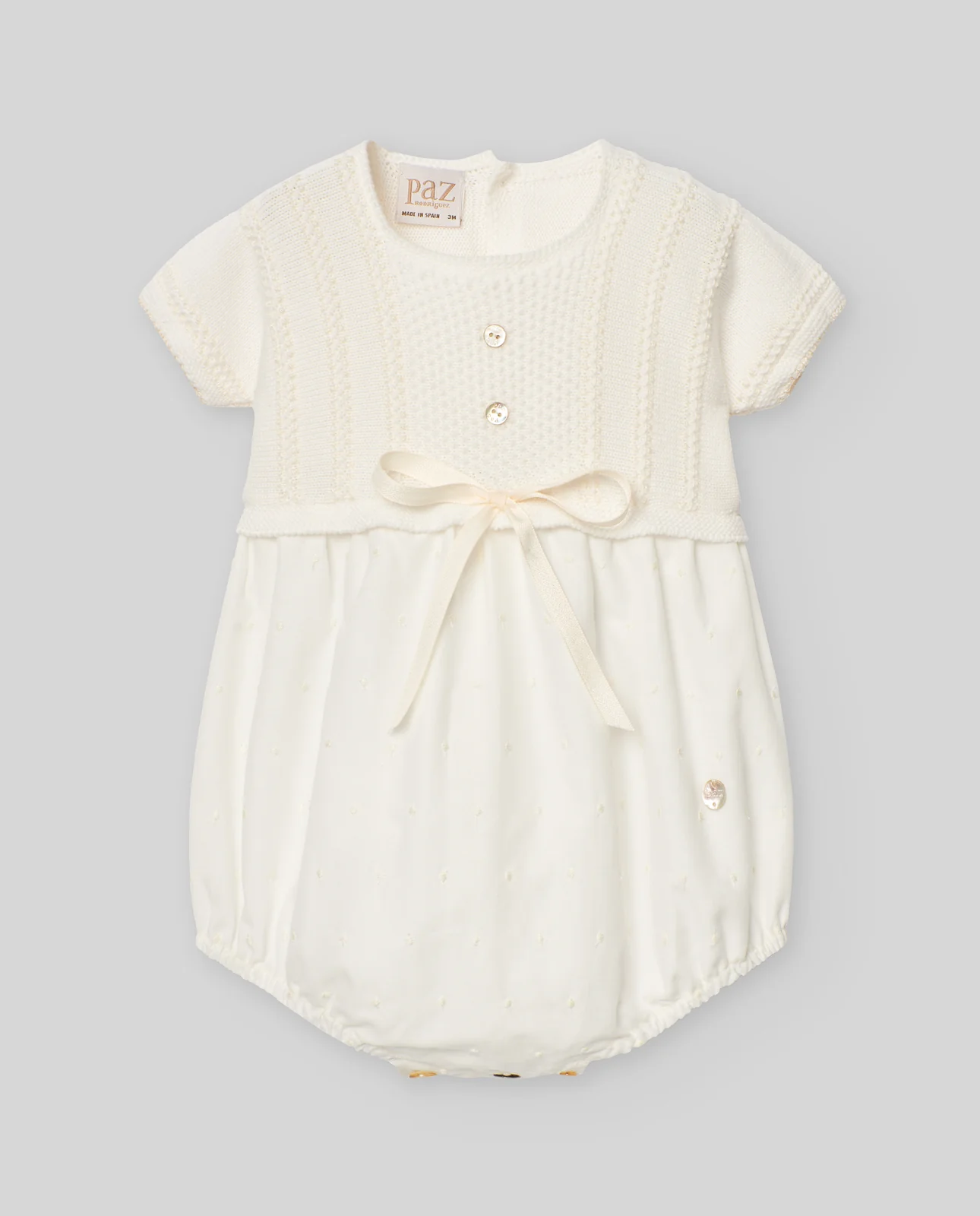 Pelele combinado de punto y tela a tono con lazada en cintura.