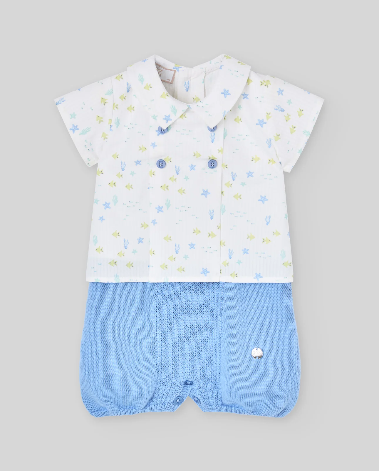 Pelele corto para bebé niño con blusa de tejido estampado y parte inferior de punto. Un diseño fresco y delicado con cuello bebé y botones decorativos, ideal para los días soleados.