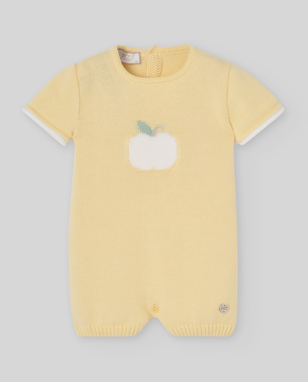 Pelele corto de punto para bebé niño o niña con motivo tejido al frente. Su diseño sencillo y artesanal aporta suavidad, frescura y encanto atemporal.