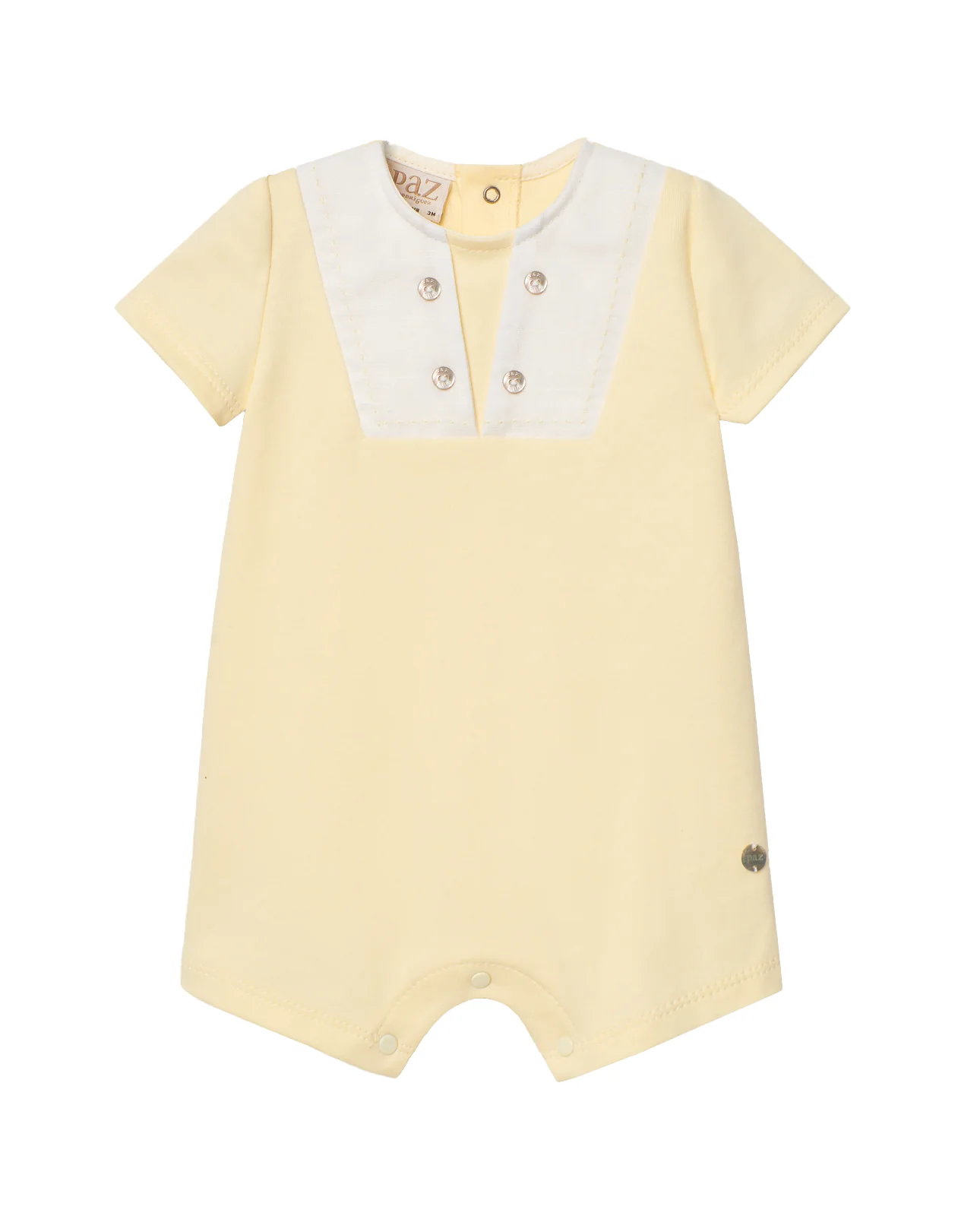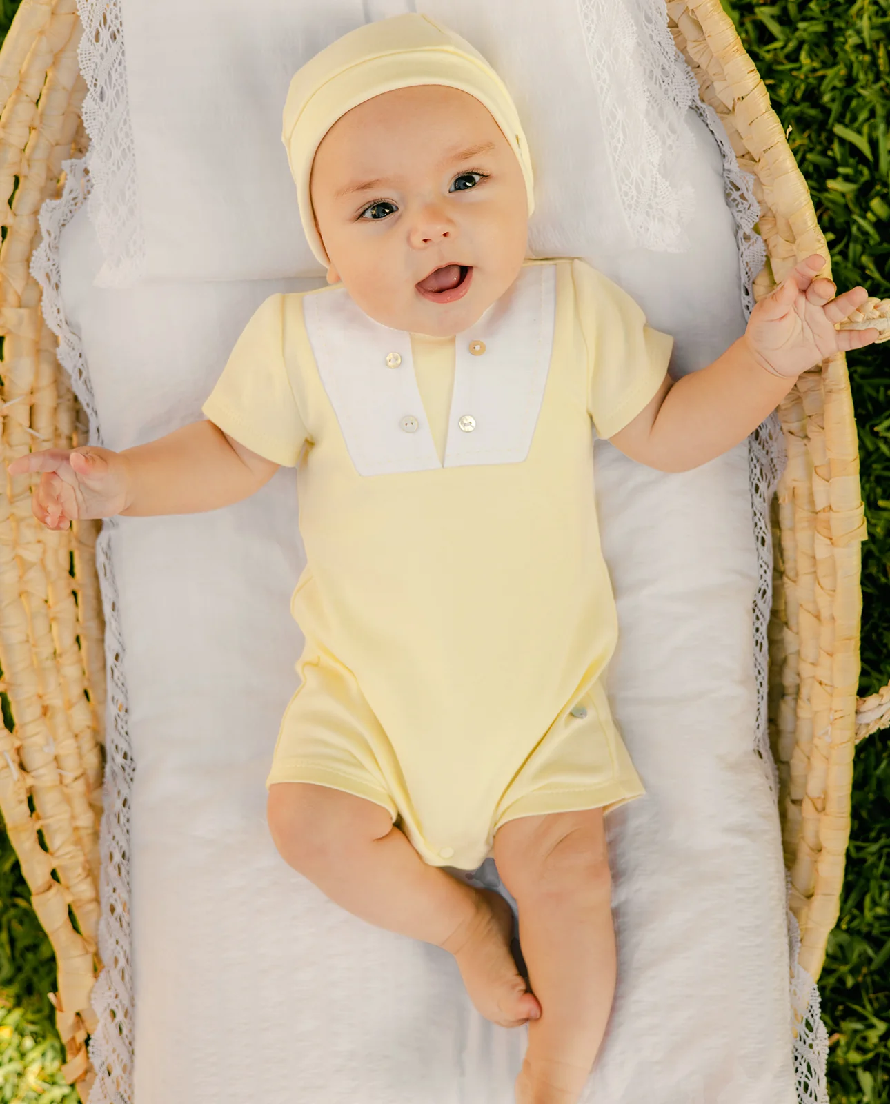 Pelele para bebé con detalle de cuello en tejido de estilo marinero. Confeccionado en interlock y disponible en varios colores, es perfecto para cuidar la delicada piel de los más pequeños. Su diseño minimalista en tonos cálidos aporta un toque alegre y versátil, perfecto para el día a día. El pelele cuenta con mangas cortas que lo hacen ideal para la temporada de primavera · verano, y su práctico cierre trasero y en entrepierna con botones de presión facilita el cambio y la vestimenta del bebé.